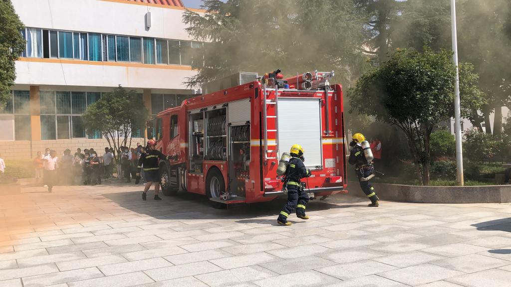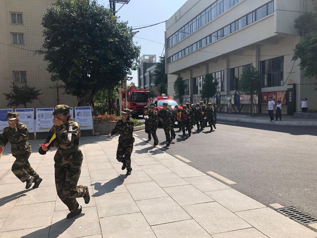 随着急促的警报铃响起,消防安全疏散演练活动正式拉开帷幕。军训教官及宿管人员迅速按照疏散路线带领学生进行撤离。学生弯腰俯身、毛巾捂住口鼻,快速、有序地从宿舍撤离到操场;针对被困学生,消防人员立即启动登高平台车、水罐消防车、抢险救援消防车等,通过灭火、登高、救援等流程,成功救援被困人员。