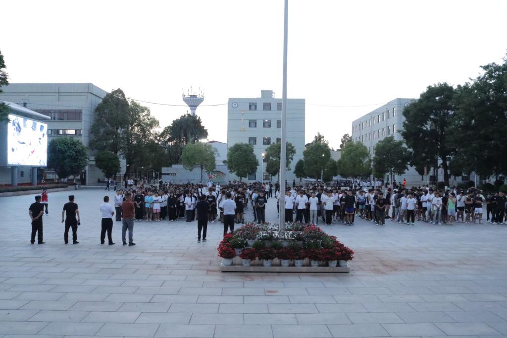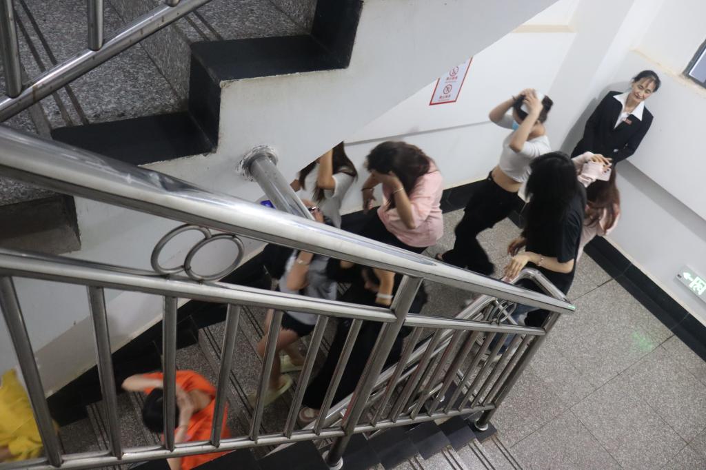 5月14日晚19:30,随着警报声响起,全校4000余名学生在宿舍内做应急避险,警报解除后,在由宿管、安保、学校“国防后备连”队员共同组成的疏散逃生引导员的指引下,学生弯腰俯身、单手持隔离物或上曲臂护头、颈等要害部位,另一手保持身体平衡,快步过楼梯,快速行走,顺次有序地分别就近疏散至学校广场、田径场。到达安全地点后,辅导员立即清点人数,并仔细检查学生状况,确保每一名学生都安全撤离。