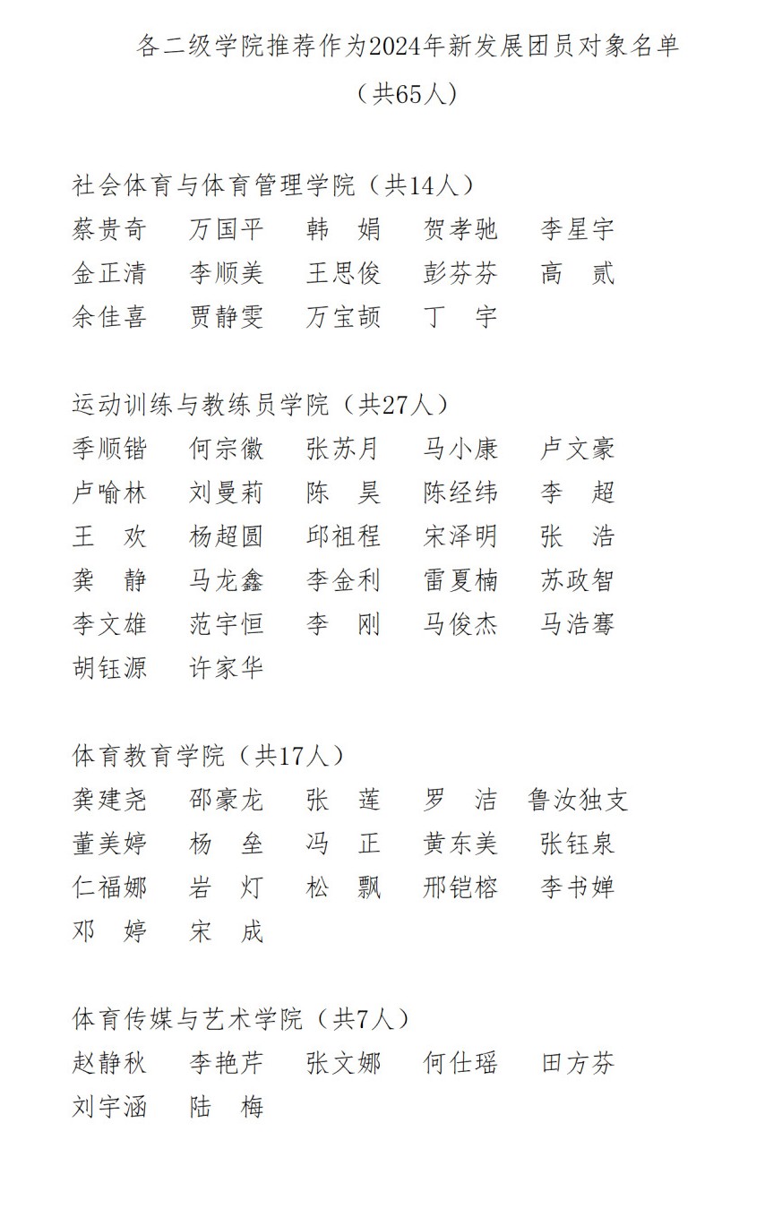 经本人申请、资格审核、民主投票、综合评议,拟推荐蔡贵奇等65名同学作为2024年新发展团员对象,现将人选名单予以公示。公示时间为2024年4月15日至4月19日。公示期间,如对拟发展对象持有异议,请向校团委反映。