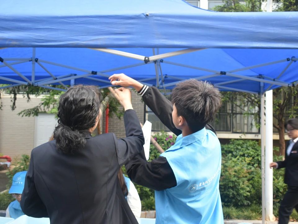 为确保考试的顺利进行,早上7点,志愿者们便纷纷忙碌起来,迅速搭建起帐篷,迎接考生的到来。他们身着统一的志愿者服装,精神饱满,面带微笑,为每一位踏入校园的考生提供周到的服务。