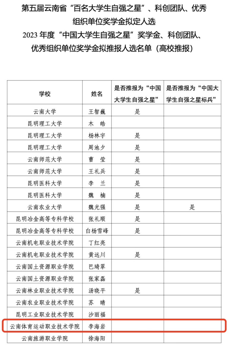 2024年3月,共青团云南省委、云南省学生联合会、云南省青少年发展基金会、华能澜沧江水电股份有限公司联合开展了寻访第五届云南省“百名大学生自强之星”活动,并择优推报参评2023年度“中国大学生自强之星”奖学金。经各高校团委、各州(市)团委推荐,省级评委会评审等环节,万象城官网2022级体育教育学院体育教育5班李海岩同学获评2023年度“云南省大学生自强之星”,鼓舞了广大体职青年在新时代新征程上踔厉奋发,勇毅前行!