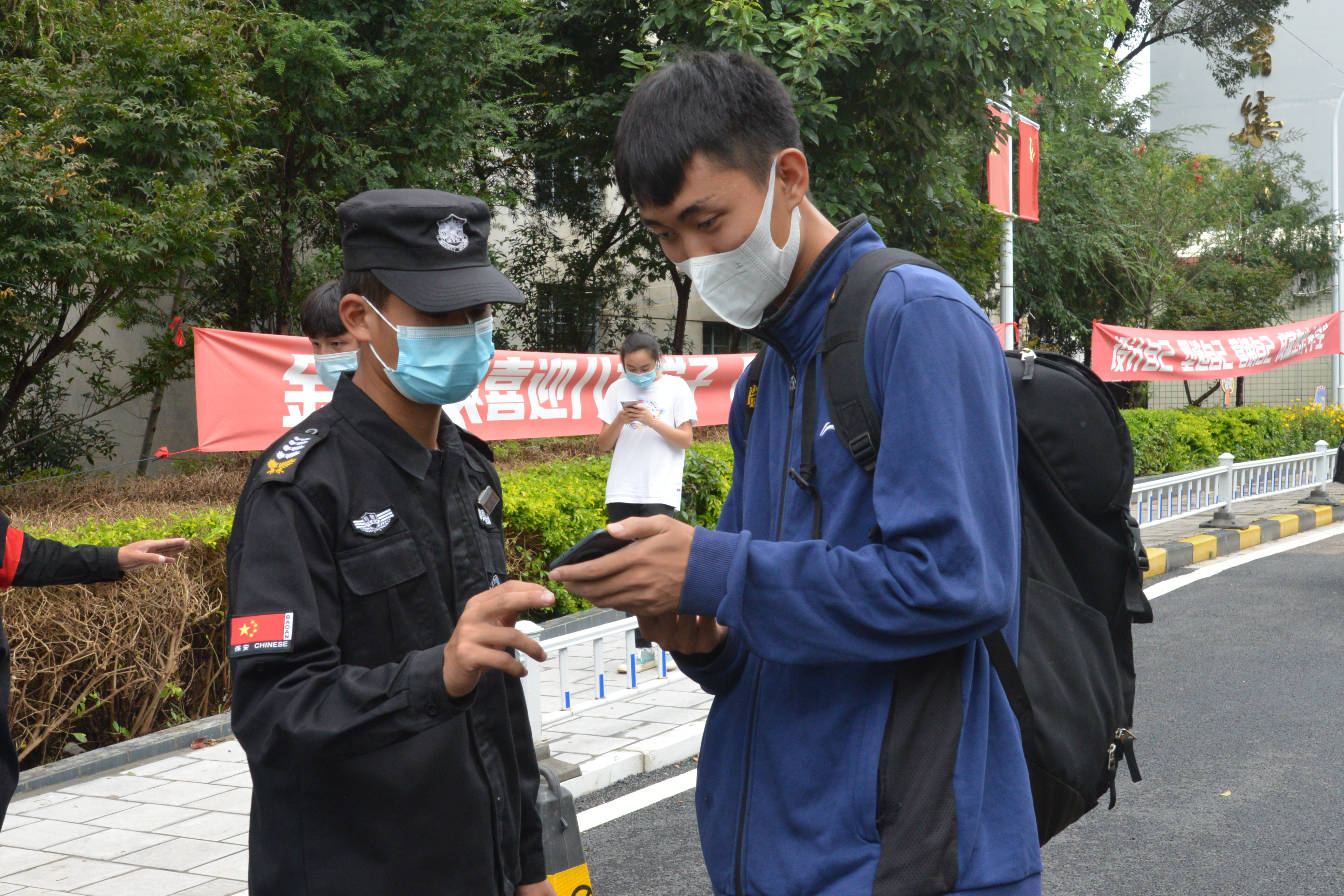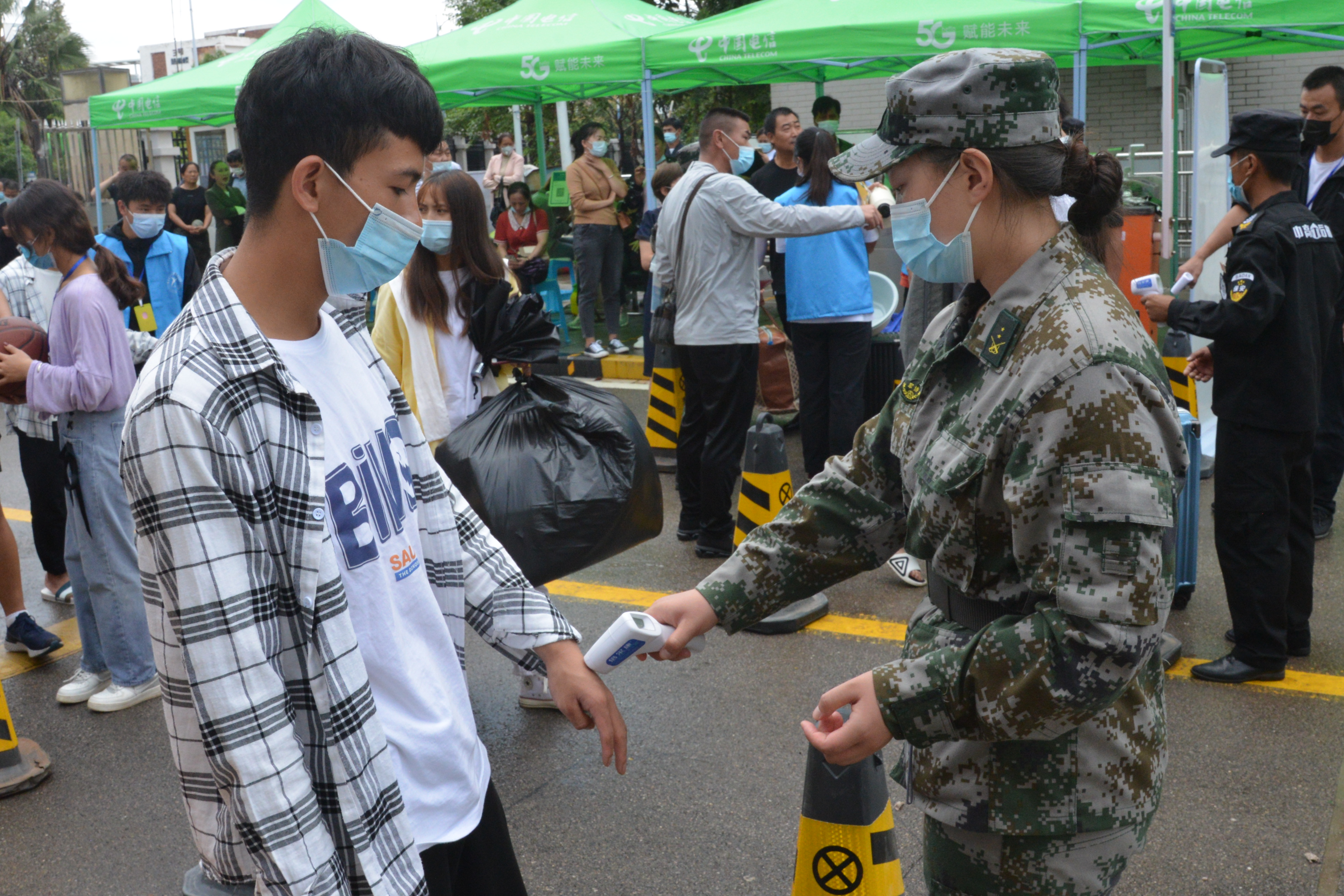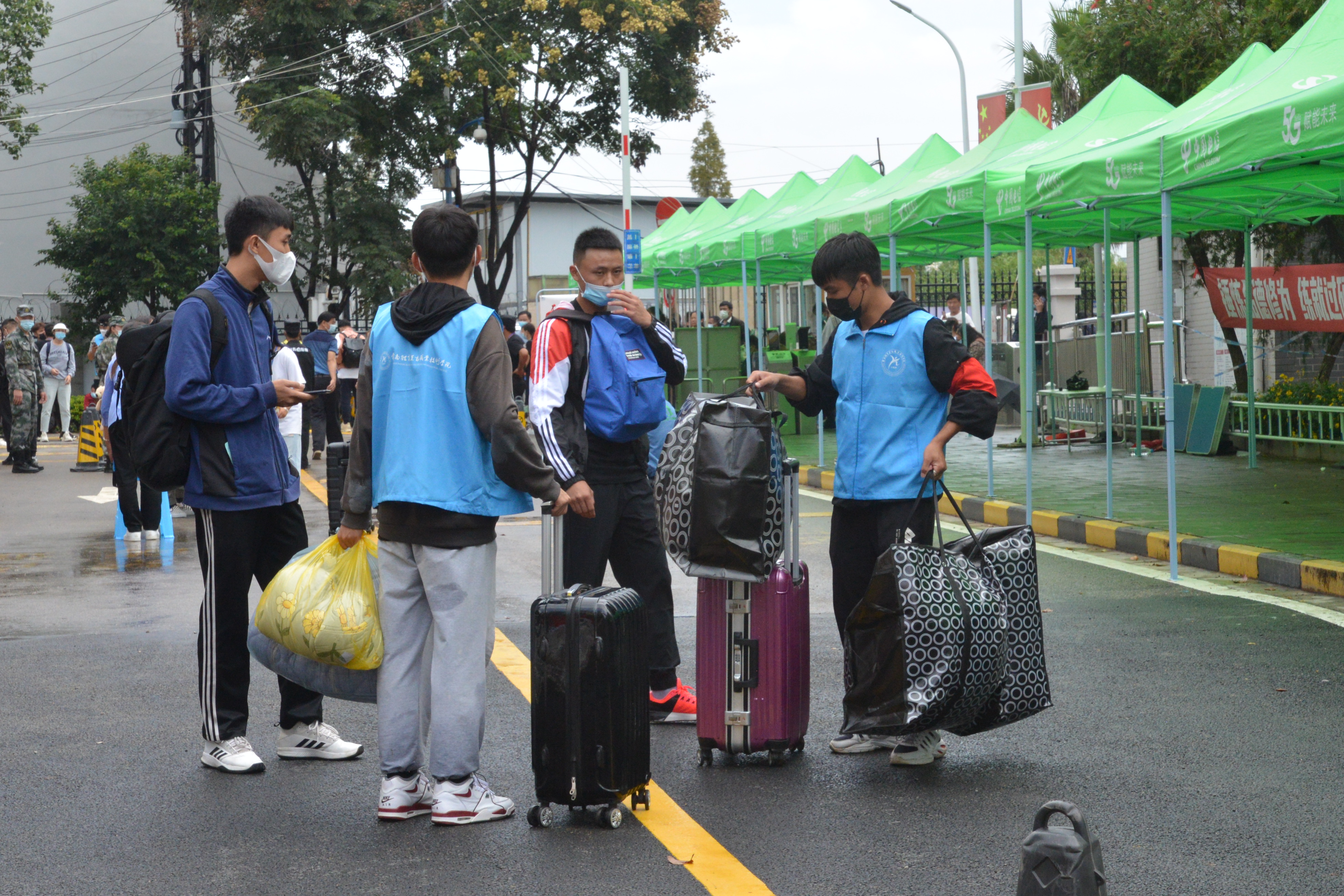 “叔叔阿姨请留步,您放心,把行李交给我们就行!” “同学你好!请出示核酸检测证明、健康码和行程码,测温无异常后进入校门。”“注意脚下,小心积水!报到登记请随我来,这边有序排队……”
