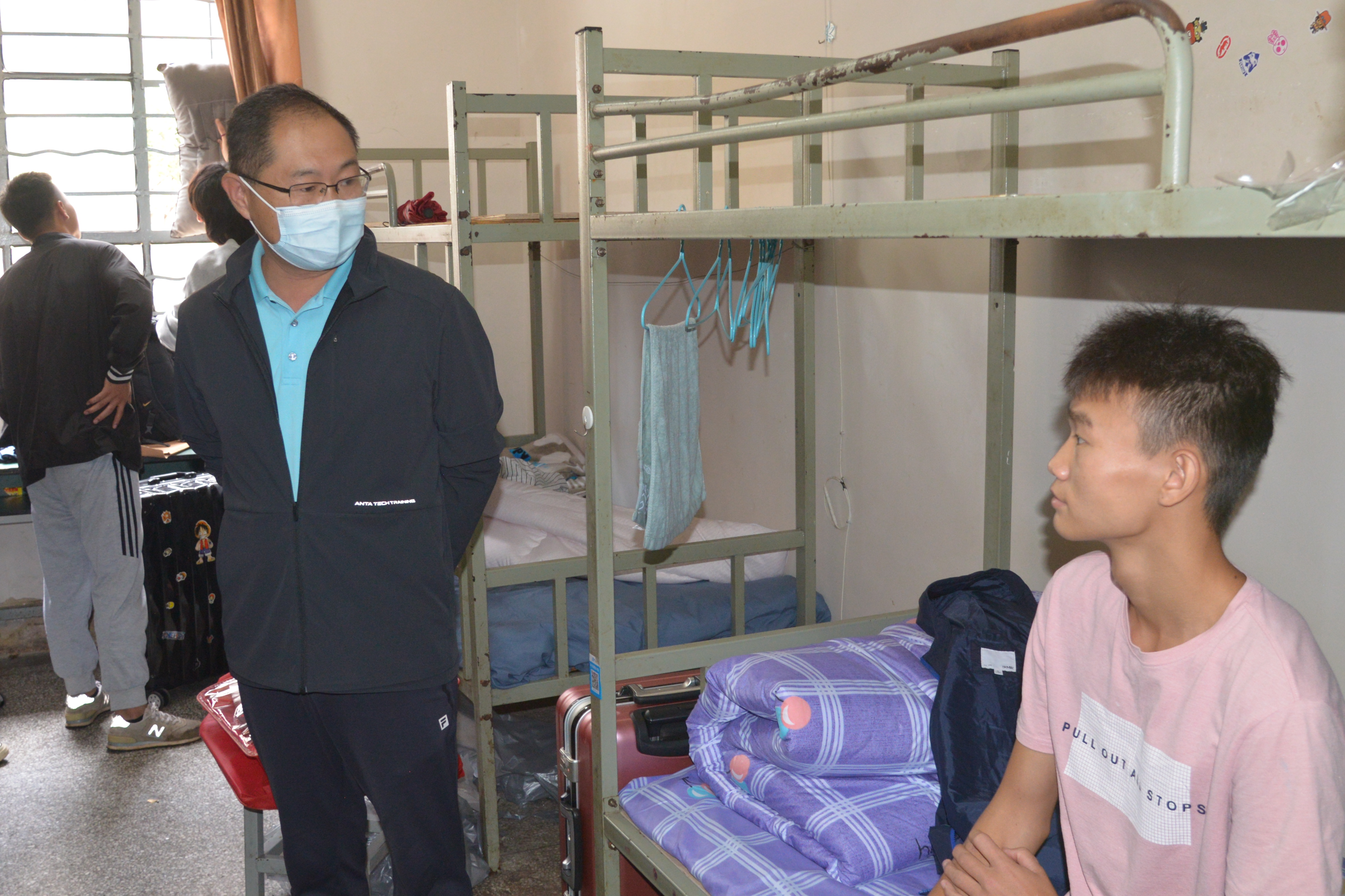 报到首日上午,学校党委书记缪军,党委副书记、院长代红兵率学校领导班子及相关职能部门负责人一行到综合楼前新生报到点、学生宿舍调研,实地查看了体育教育学院、社会体育与体育管理学院、招就处新生注册手续办理点,看望了现场工作人员,并对迎新工作给予了充分肯定,强调要在做好疫情防控工作的前提下,为新生报到提供细致的服务工作,确保新生开学顺利有序进行。“同学,家是哪里的?”“迎新工作中有没有遇到什么困难?”书记、院长一行在学生宿舍问候了刚入住的新同学,了解了入住宿舍新生的基本信息以及来校路途情况,并勉励同学们在新的环境中尽快适应大学生活。缪军书记、代红兵院长一行还实地查看了学生食堂,学校新建设的迎新管理系统,学校改扩建的停车棚、花坛等项目工地。