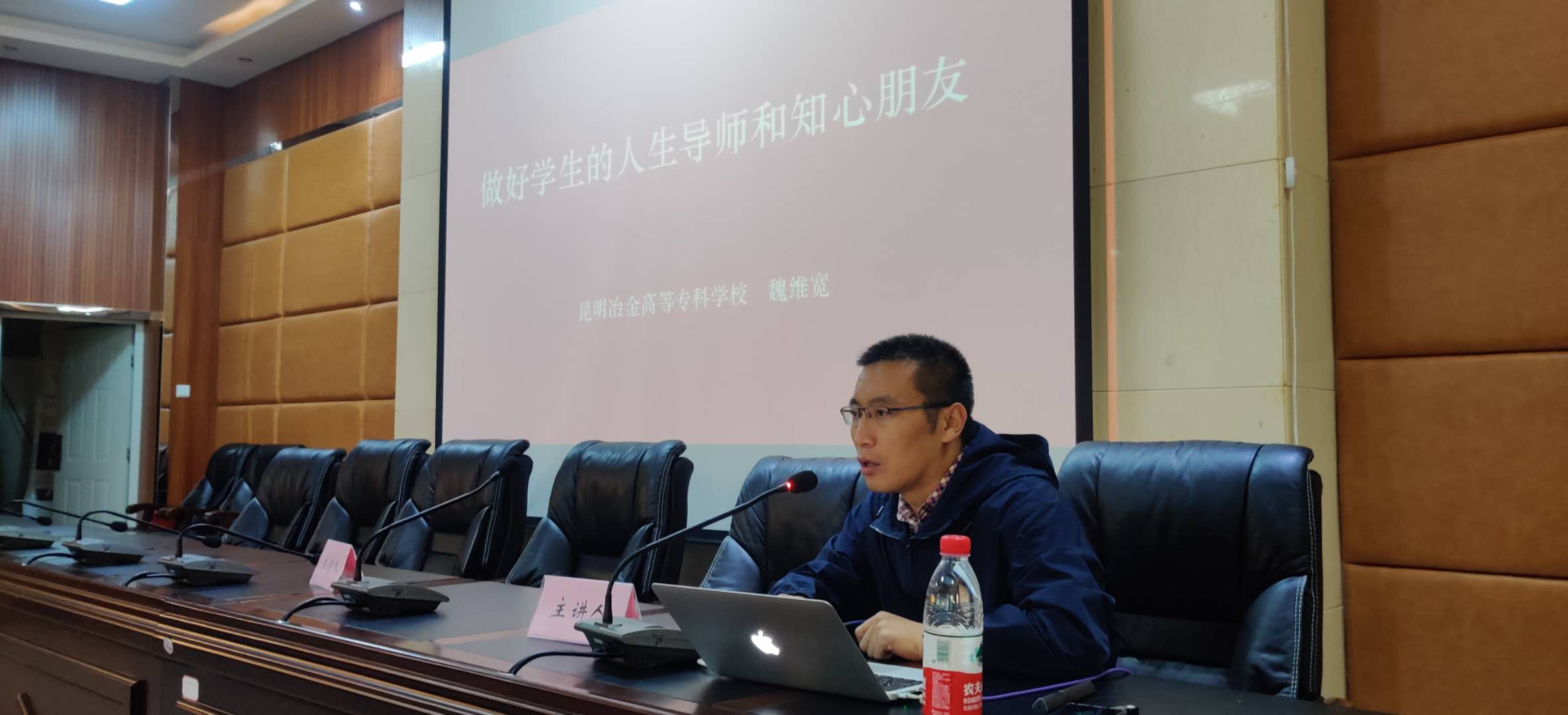 培训的最后一天,来自昆明冶金高等专科学校学生思政中心主任魏维宽老师,针对班主任、辅导员工作展开了一场“用心永爱做好学生引路人”的专题讲座,他首先从大家对辅导员的固化认知切入,介绍了辅导的工作范畴,讲述了辅导员的工作职责和要求。
