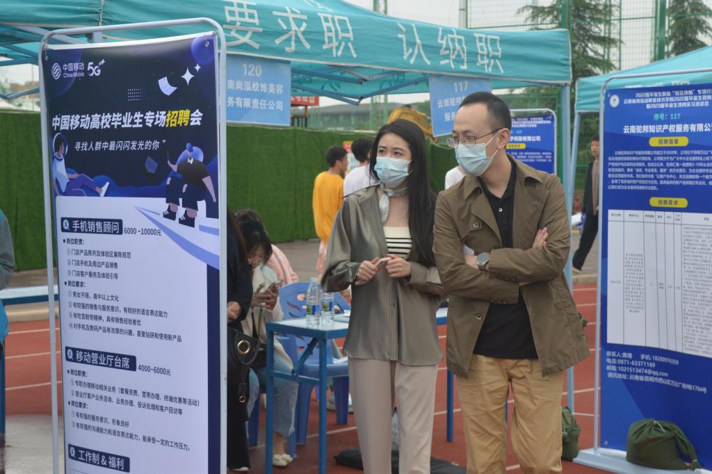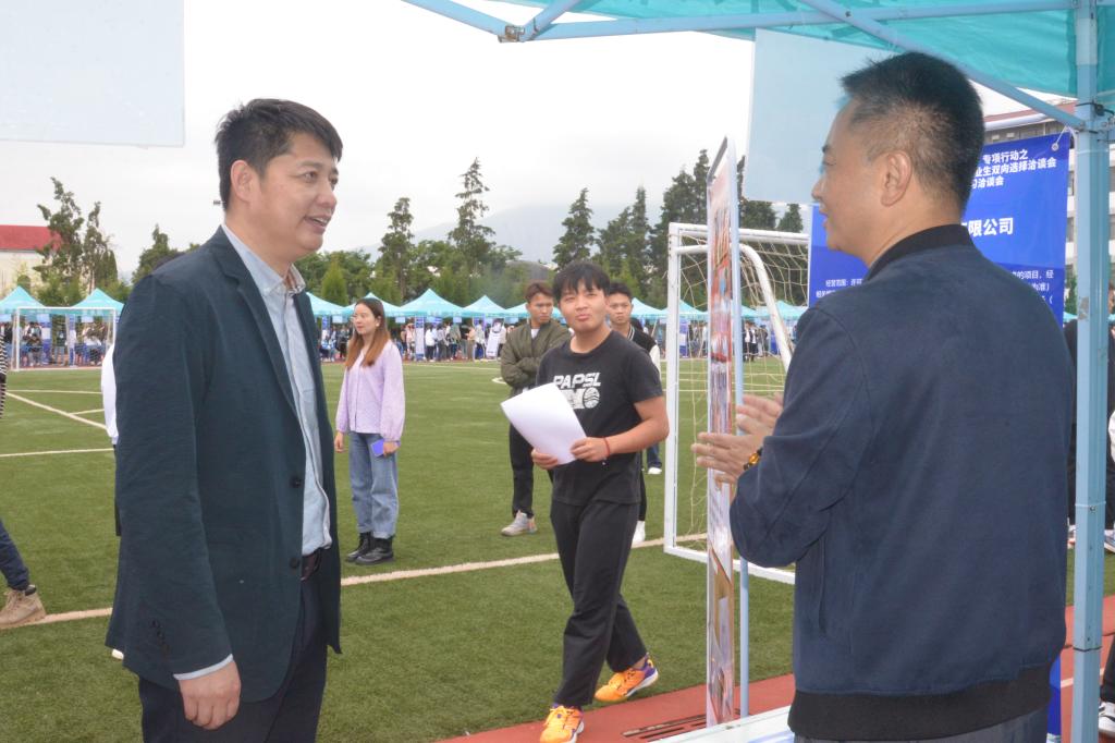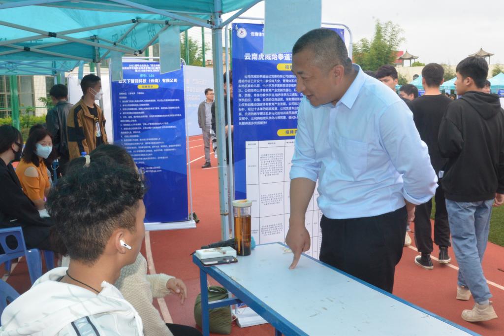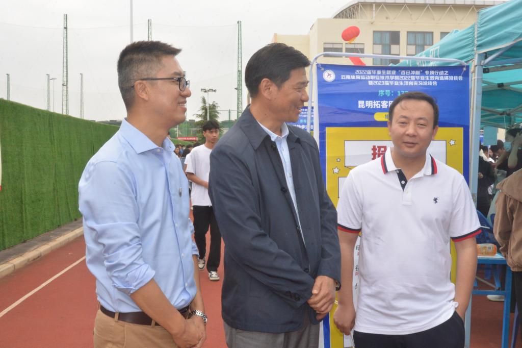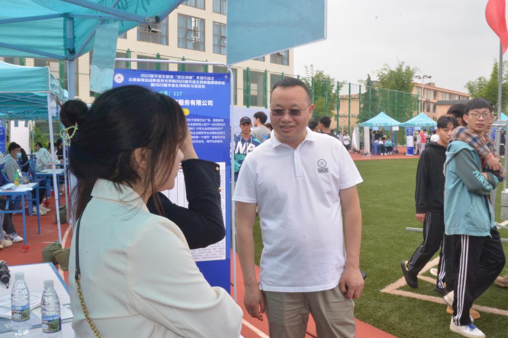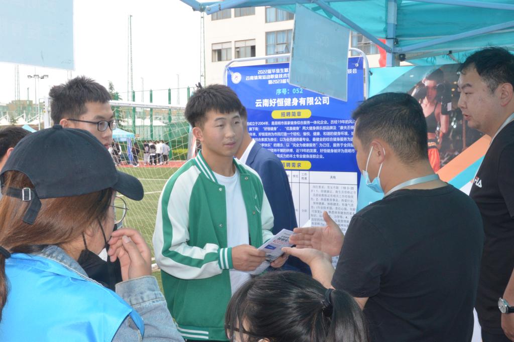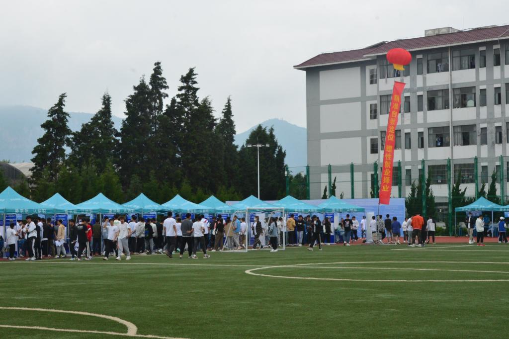 5月31日,2022届毕业生就业“百日冲刺”专项行动——allwincity万象城官方网站2022届毕业生校园双向选择洽谈会暨2023届毕业生顶岗实习洽谈会,在学校小田径场如火如荼地开展。本次双选会采用学生志愿者代为招聘的方式进行,所有参加的毕业生和用人单位代表均严格落实昆明市疫情防控相关要求。双选会共有190余家用人单位参与选聘人才,提供就业岗位6300余个,涉及体育、教育、制造业、信息、食品、管理、营销等多个领域,学校共有2000余名毕业生参加了双选会,800余人达成初步意向。