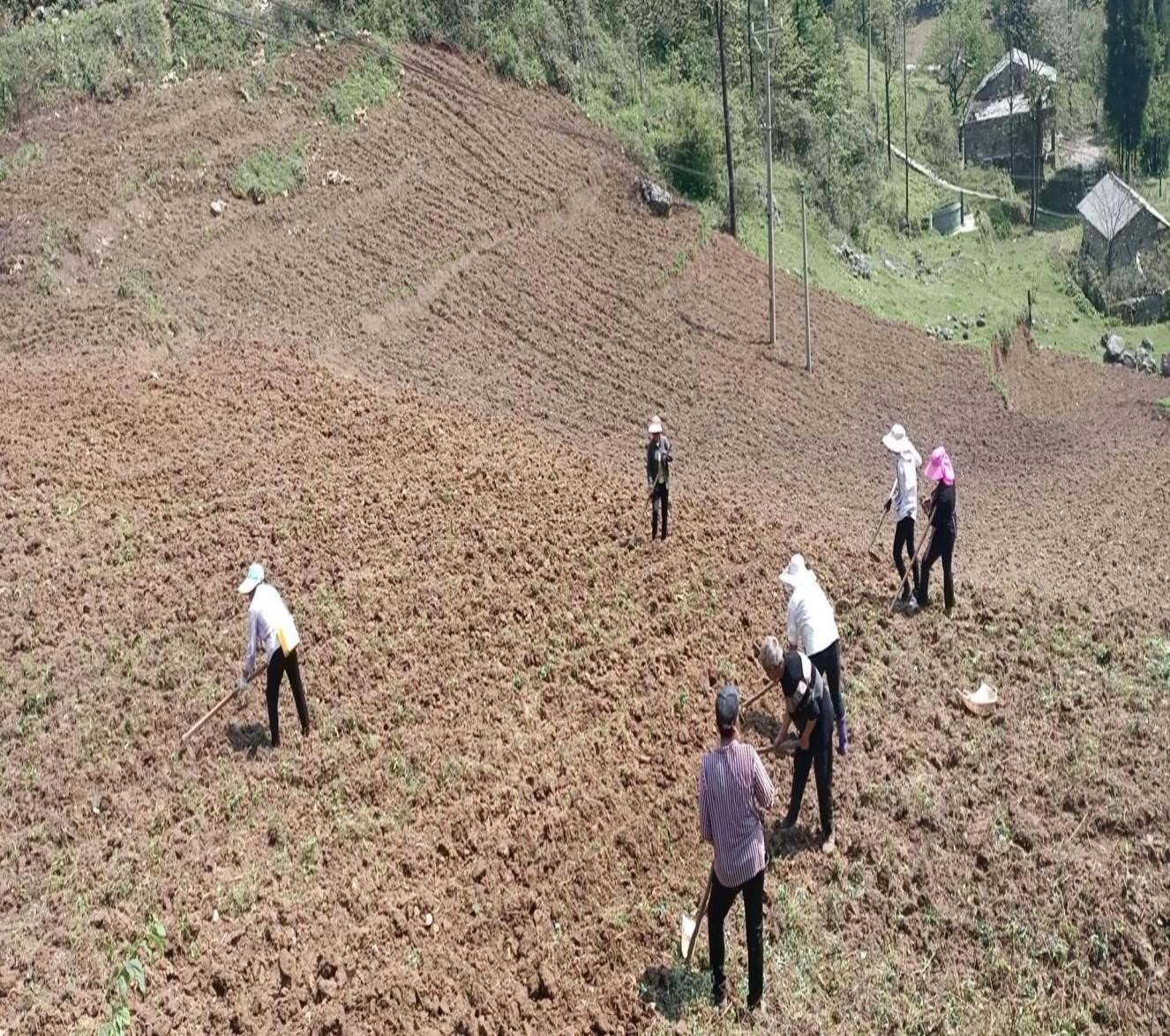 4月中旬开始,每天早上,驻村工作队员都抓紧时间把手头的工作处理完,午饭过后放弃午休时间,自己驾车1个小时来到岩脚。穿上胶鞋,拿起锄头、挥起铁锹,同村民们“拧在一起、干在一起”,出工出力。