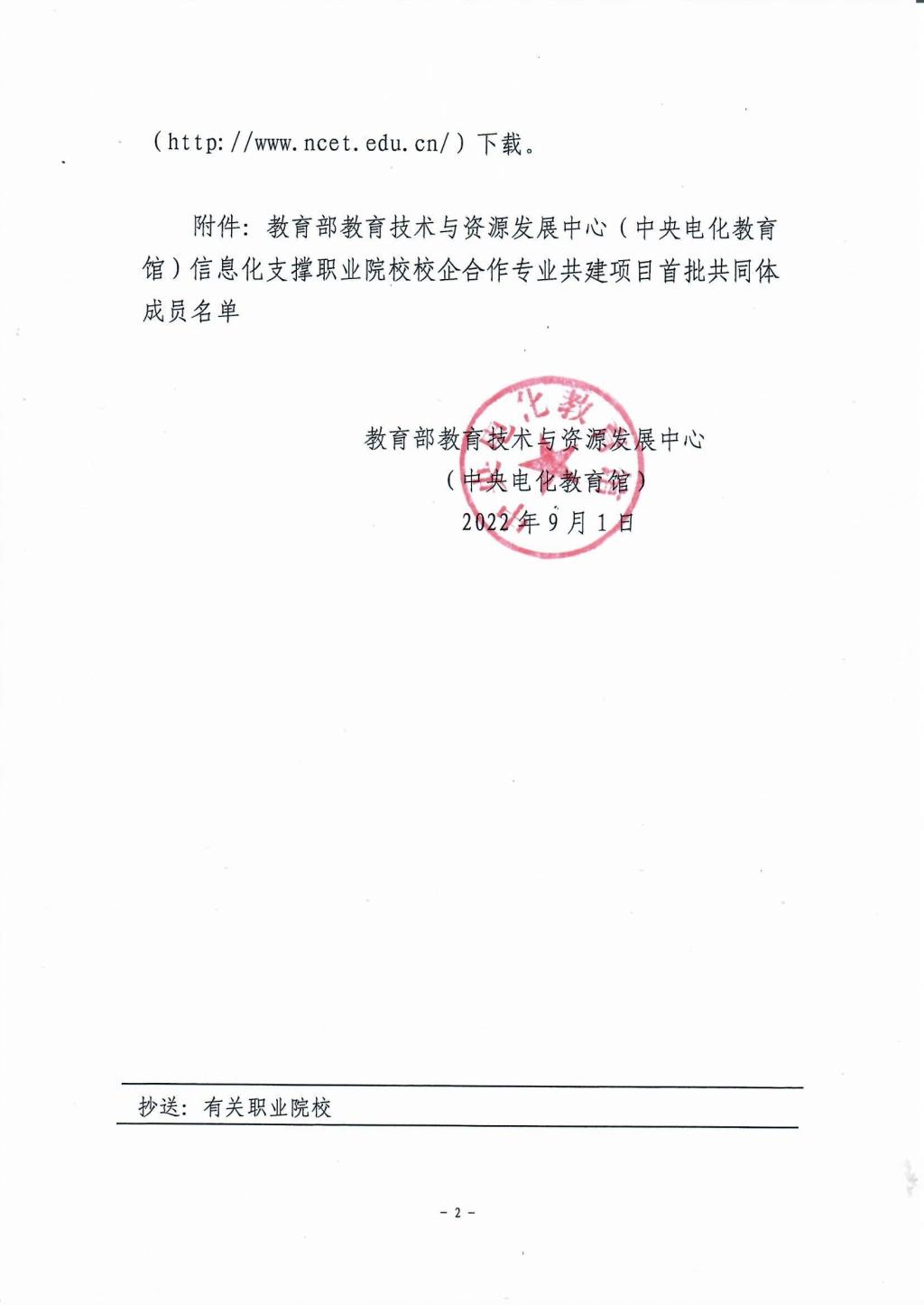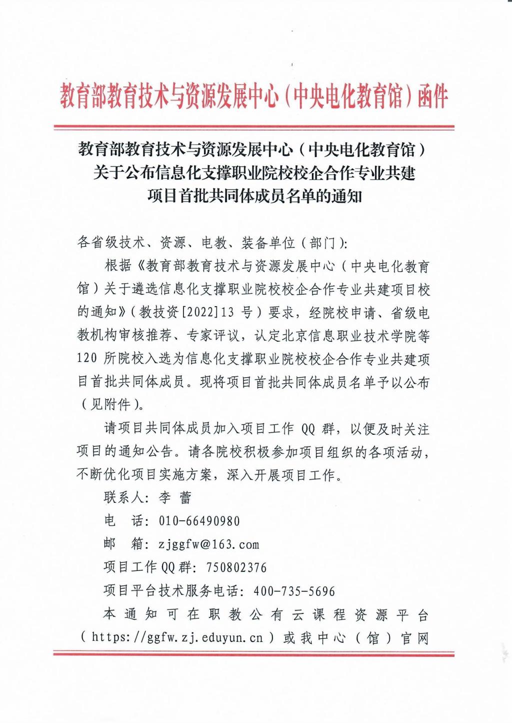 2022年9月1日,教育部教育技术与资源发展中心(中央电化教育馆)公布了信息化支撑职业院校校企合作专业共建项目首批共同体成员名单,万象城官网成功入选首批共同体成员。