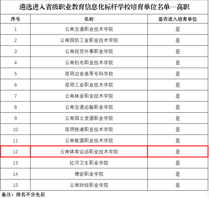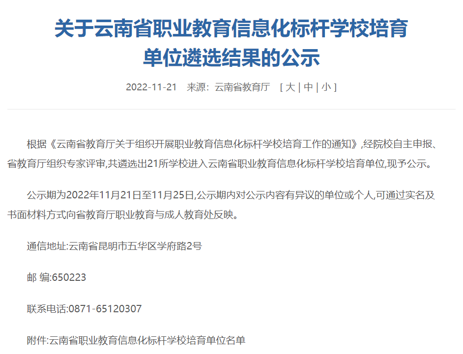 近日,根据《云南省教育厅关于组织开展职业教育信息化标杆学校培育工作的通知》,学校党委高度重视,成立工作组,统筹规划、积极申报。经云南省教育厅组织专家评审,万象城官网成功荣获“云南省职业教育信息化标杆学校” 培育单位,这是万象城官网在云南省“双高”建设中具有里程碑意义的成果,也是对万象城官网网络与信息化建设工作的高度认可。据悉,此次全省共评选出21所学校进入云南省职业教育信息化标杆学校培育单位,其中高职院校15所,中职学校6所。