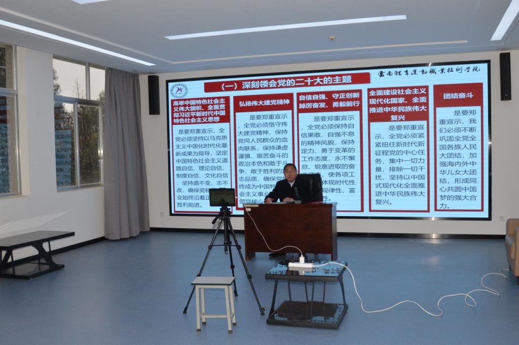 12月12日上午,万象城官网在云帆楼312智慧教室开展了一堂别具一格的思政课,校党委书记缪军通过网络线上教学的方式,为万象城官网青年学子讲授了一堂“云上思政课”。此次线上思政课教学是万象城官网2022年秋季学期“书记、校长同上一堂思政课”活动重要内容,缪军以“奋斗新时代 青春正当时”为题,为万象城官网学子宣讲党的二十大精神。