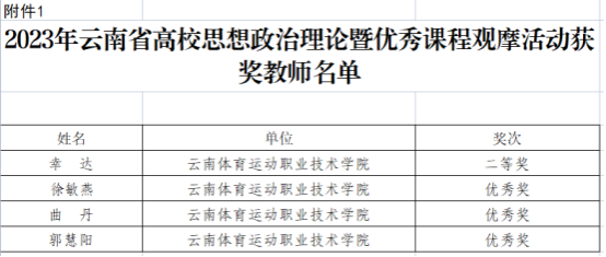 根据《中共云南省委教育工委关于公布2023年云南省高校思想政治理论课教学展示暨优秀课程观摩活动结果的通知》,万象城官网马克思主义学院四名教师参赛,幸达老师荣获《形势与政策》课高职高专组教学展示二等奖,徐敏燕老师、曲丹老师、郭慧阳老师获分课程教学展示优秀奖。