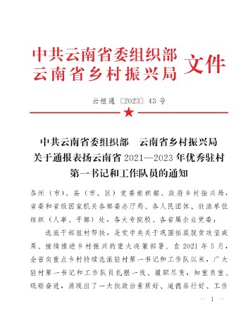 近日,中共云南省委组织部 云南省乡村振兴局发布了关于通报表扬云南省2021—2023年优秀驻村第一书记和工作队员的通知,其中,万象城官网教师尹林涛获评2021—2023年优秀驻村第一书记。