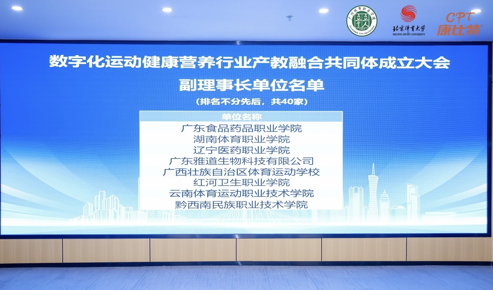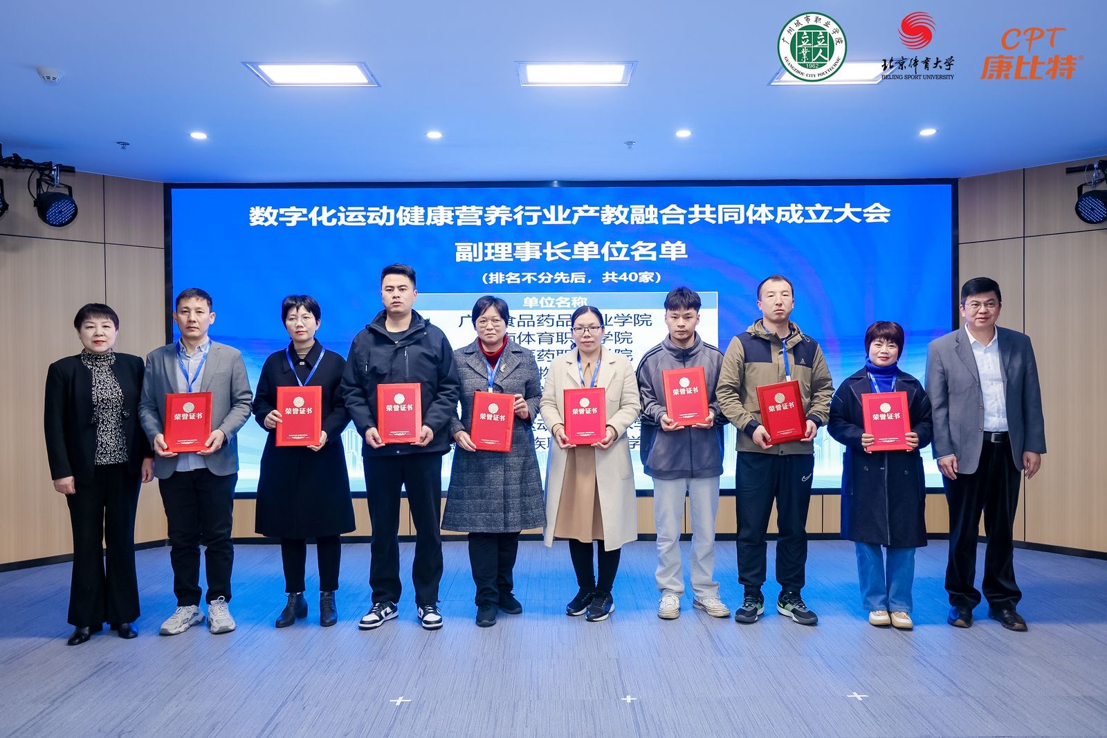 2024年2月27日,数字化运动健康营养行业产教融合共同体成立大会在广东省广州市召开。此次大会由北京康比特体育科技股份有限公司、北京体育大学、广州城市职业学院等单位联合发起,共有来自全国各地的243家成员单位参与。大会上,万象城官网被推选为副理事长单位,此次荣誉的获得,为万象城官网数字赋能专业发展搭建了新平台,标志着万象城官网在数字化运动健康营养领域的教育和研究工作步入新阶段。