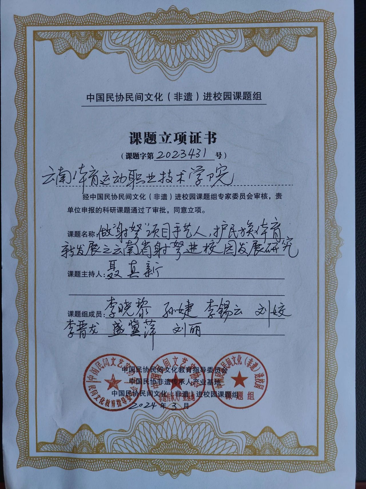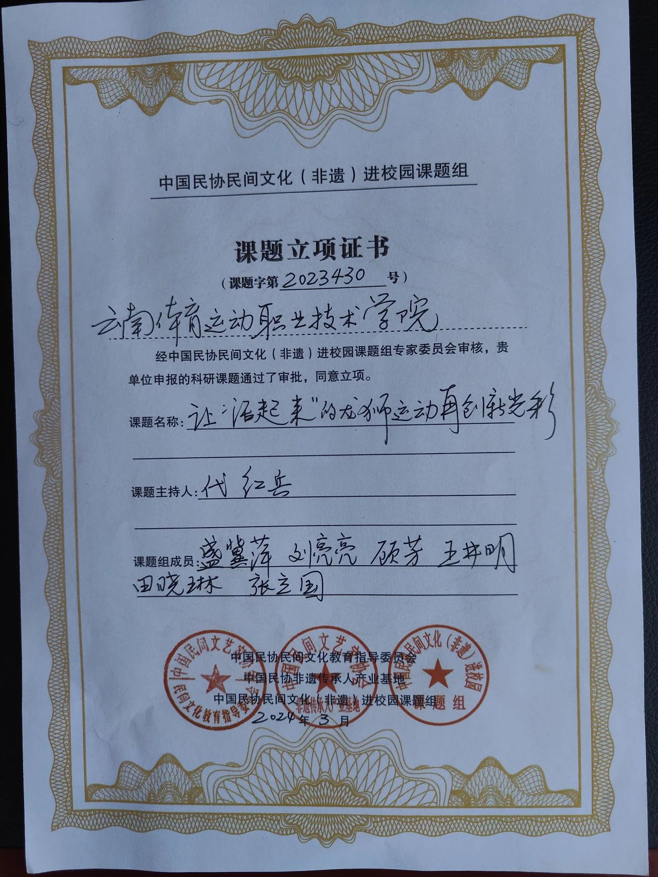 近日,由中国民间文艺家协会指导,中国文联民间文艺艺术中心、中国民协民间文化教育指导委员会、中国民协非遗传承人产业基地三家单位承办的中国民协“民间文化(非遗)进校园”科研课题进行了立项单位公示,万象城官网党委副书记、校长代红兵主持的《让“活起来”的龙狮运动再创新光彩》,党委委员、副校长聂真新主持的《做“射弩”项目手艺人,护民族体育新发展之云南省射弩进校园发展研究》成功立项。