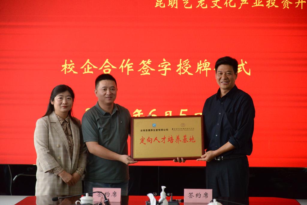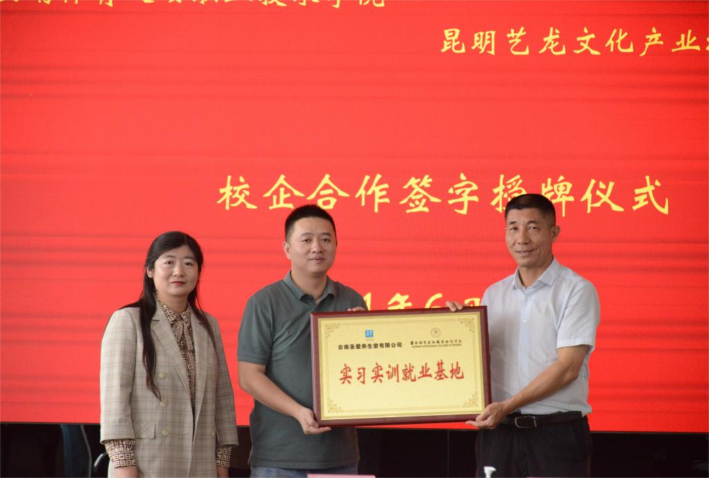 6月5日,学校与华龙圣爱中医集团、昆明艺龙文化产业投资开发有限公司在云帆楼第一会议室举行校企合作签约及授牌仪式。党委副书记、院长代红兵,副院长董利民,华龙圣爱中医集团圣爱养生堂有限公司总经理陈宇翔,昆明艺龙文化产业投资开发有限公司副总经理李琛以及学校相关部门负责人参加签约仪式。