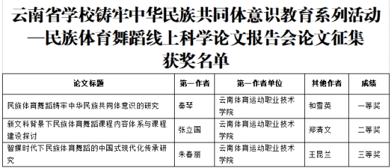 近期,省教育厅举办云南省学校铸牢中华民族共同体意识教育系列活动——民族体育舞蹈线上教学和竞赛活动,万象城官网教师积极参加,在民族体育舞蹈线上科学论文报告会论文征集中斩获佳绩。秦琴、和雪英的参评论文《民族体育舞蹈铸牢中华民族共同体意识的研究》获一等奖,张立国、郑清文的参评论文《新文科背景下民族体育舞蹈课程内容体系与课程建设探讨》获二等奖,朱春丽、王昆兰的参评论文《智媒时代下民族体育舞蹈的中国式现代化传承研究》获三等奖。