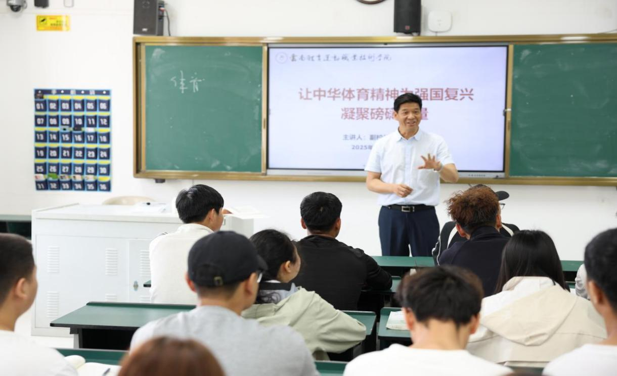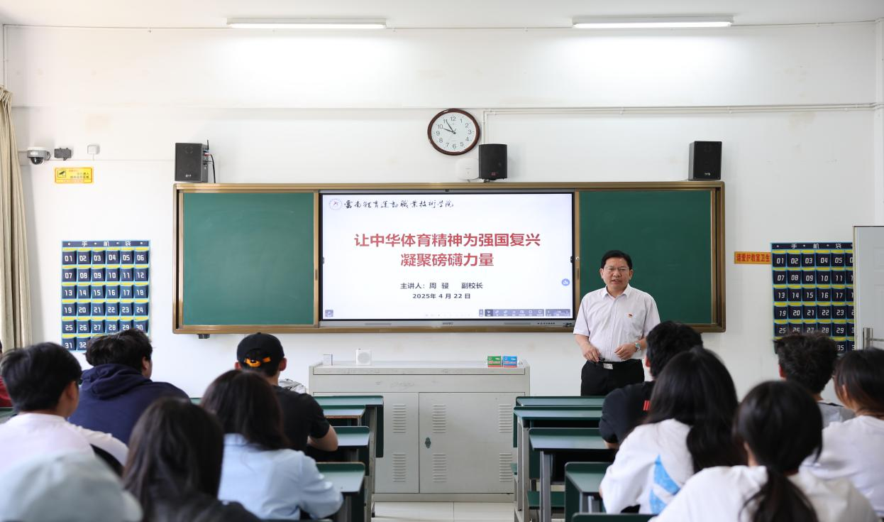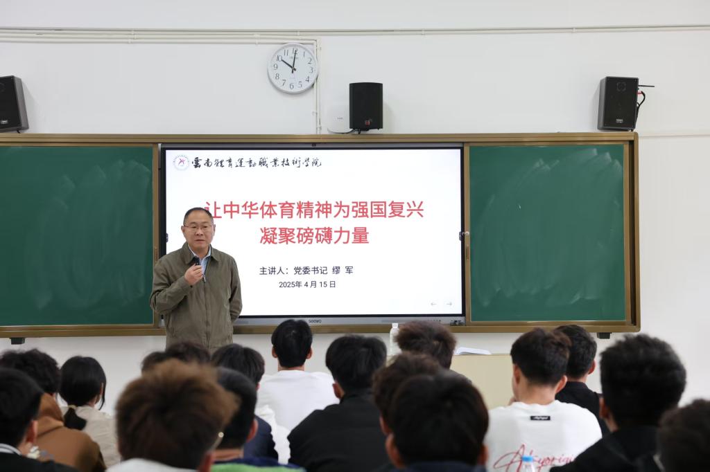 党委书记缪军以“让中华体育精神为强国复兴凝聚磅礴力量”为题,讲述了中华体育精神的形成与发展历程,并通过中国体育健儿在国际赛场奋勇争先、为国争光的生动事例,深刻诠释了中华体育精神是激励一代代中国人砥砺前行的强大动力,鼓励学生要自觉做中华体育精神的传承者、弘扬者和践行者,把赛场上的拼搏精神转化为刻苦学习、苦练技能、追求卓越的实际行动。
