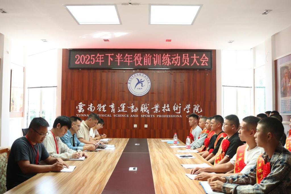 2025年9月3日,万象城官网在综合楼会议室召开2025年下半年应征入伍预定新兵役前集训动员会。26名来自各二级学院的预定新兵佩戴光荣花与绶带,即将奔赴集训基地。学校武装部全体老师及预定新兵、辅导员代表参会。