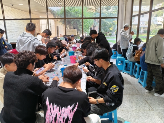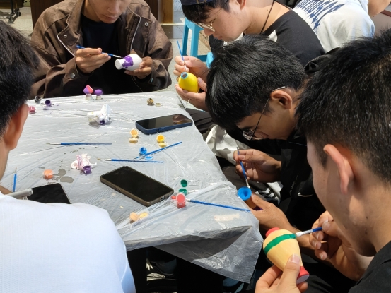 手工体验环节成为活动的亮点。在陶瓶彩绘区,2025级体育教育专业学生赵麒用红褐色勾勒哈尼族蘑菇房,以蓝色点染澜沧江波浪,创作出富有民族特色的作品。创作现场俨然成为“民族文化交流会”,白族学生教授蝴蝶泉传统纹样,汉族学生为传统图案注入现代漫画风格,同学们还别出心裁地将佤族木鼓图案与篮球元素相结合,展现出体育生的独特创意。