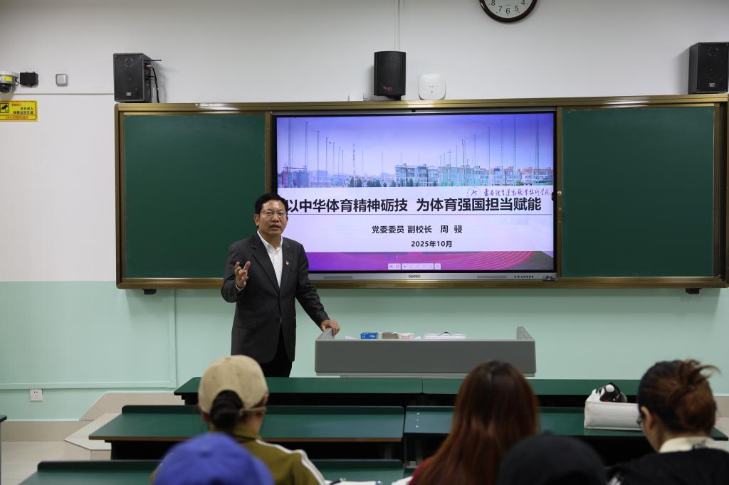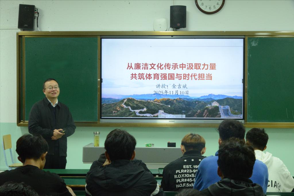 授课过程中,校领导班子成员围绕习近平总书记关于体育的重要论述、中华体育精神、铸牢中华民族共同体意识以及廉洁文化传承等主题,深刻阐述了弘扬中华体育精神、铸牢中华民族共同体意识、坚守廉洁品格对于个人成长与时代担当的重要意义。课程内容既有思想性和理论性,又饱含热忱与感召力,以深入浅出的方式帮助同学们理解体育强国建设、民族团结进步、廉洁文化传承等重大议题的深刻内涵,引导同学们深刻认识到体育与国运相牵、青春与时代相连,要争做体育强国路上的“追梦者”与“奋进者”,树立远大理想、明确人生目标,努力成为有理想、敢担当、能吃苦、肯奋斗的新时代好青年。