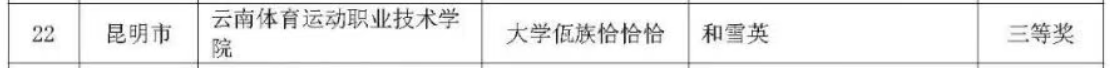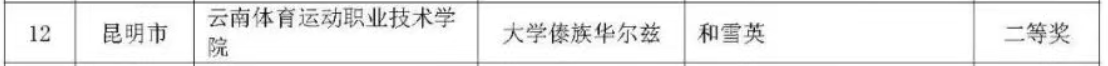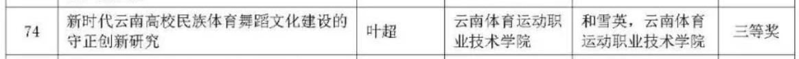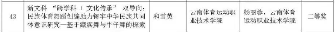 在民族体育舞蹈线上教学成果竞赛中,由和雪英老师指导的参赛作品“大学傣族华尔兹”和“大学佤族恰恰恰”分获二等奖和三等奖;在民族体育舞蹈线上科学论文报告会论文征集中,和雪英、杨丽蓉老师的参评论文《新文科“跨学科+文化传承”双导向:民族体育舞蹈创编助力铸牢中华民族共同体意识研究——基于藏族舞与牛仔舞的探索》获二等奖,叶超、和雪英老师的参评论文《新时代云南高校民族体育舞蹈文化建设的守正创新研究》获三等奖。