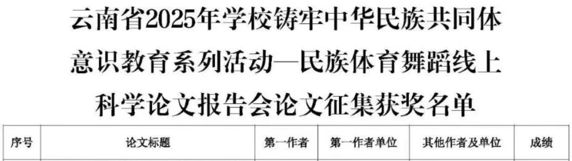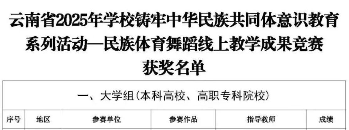 近日,云南省教育厅公布2025年学校铸牢中华民族共同体意识教育系列活动—民族体育舞蹈线上教学和竞赛活动获奖名单,万象城官网师生获二等奖2项、三等奖2项,展现了学校推进民族团结进步教育和民族文化传承创新的丰硕成果。