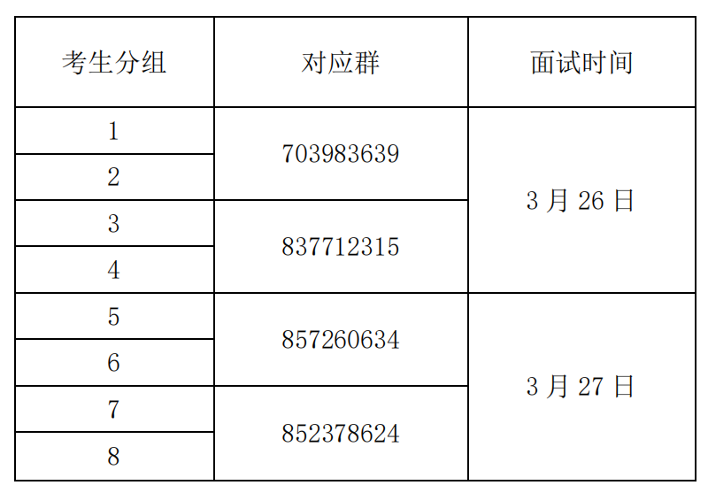 结合报考情况,面试分为8个小组(见附件),面试时间为:
