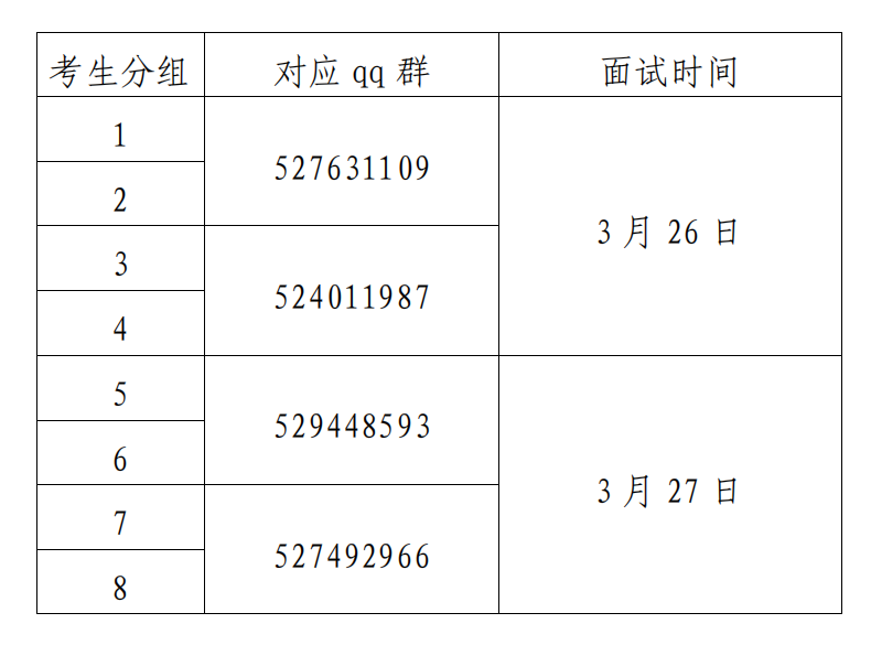 请考生下载附件查看分组后,加入对应的qq群,qq群用于面试候考及面试相关信息发布,面试时由联络员(群管理员)告知腾讯会议号码。请勿错加、重复加群,进群后修改备注为:
