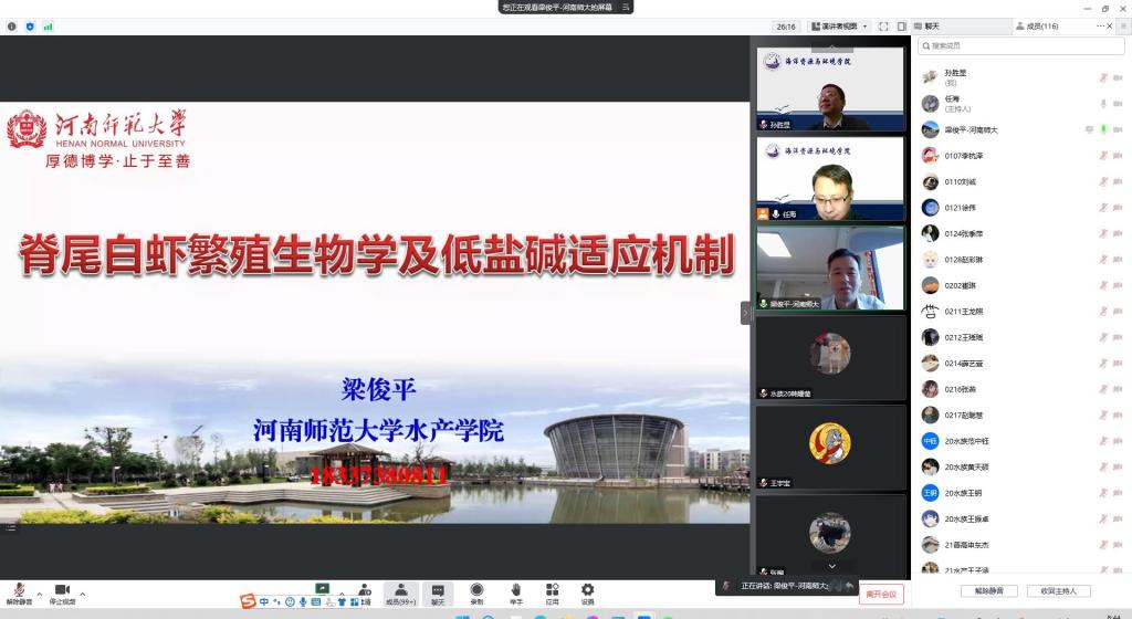 2022年10月23日上午,betway西汉姆联官网三期海洋论坛活动在腾讯会议线上进行,本次活动邀请了优秀校友河南师范大学梁俊平博士给我院师生做学术报告。会议由水产科学教学部任海博士主持,水产科学教学部全体教师、渔业发展硕士研究生以及betway官网本科生300余人收听了报告,学院党委副书记、副院长孙胜显出席会议。
