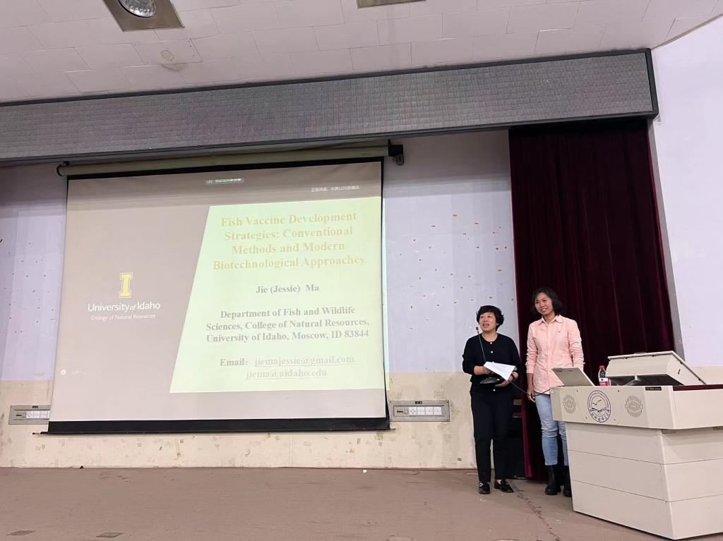 会上,学院副院长张文香首先对优秀校友马杰研究员表示了欢迎,鼓励与会的同学好好学习,为母校争光。随后马杰研究员做了题为“Fish Vaccine Development Strategies: Conventional Methods and Modern Biotechnological Approaches(鱼类疫苗开发策略:传统和现代生物技术方法)”报告,马杰研究员提到随着水产养殖业高密度、规模化、集约化高速发展,病害已成为产业健康可持续发展的重大挑战,鱼类接种疫苗既可以防控水产病害发生、减少产业的经济损失,又可以减少或消除由于大量使用抗生素带来的健康危害、生态风险和水产品食品安全等问题,从而支撑水产养殖业健康、绿色发展。目前国内外鱼类疫苗开发主要包括灭活疫苗、减毒活疫苗、亚单位/合成肽疫苗和DNA /RNA疫苗。在报告中,她详细介绍了疫苗主要研究技术策略及相应的接种、递送方式,着重介绍爱达荷大学鱼类健康实验室研制并商业化的鱼类疫苗及其应用,以及国际疫苗审批管理的情况。