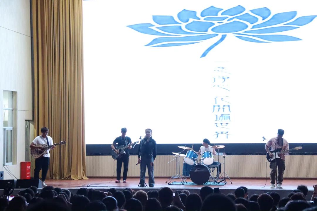 吉他社乐队为激励同学们坚定自己的理想与信念,在困顿颓废时,在“无处不在的枷锁之中”一定不能放弃,而是要坚持自己的方向,站起来,继续向前。倾情演绎了一首《蓝莲花》,也将此次晚会推向尾声。