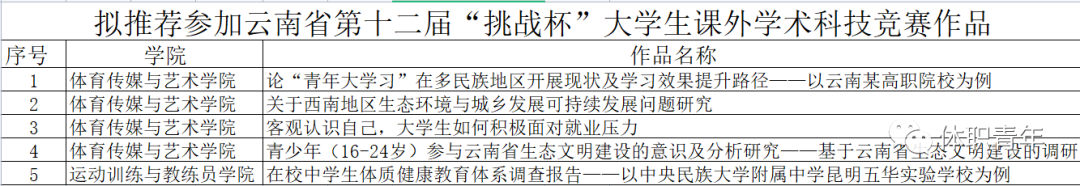 为贯彻落实党的二十大精神,深入实施科教兴国战略、人才强国战略、创新驱动发展战略,进一步引导万象城官网学生努力培养科学精神和科学态度,积极学习科学知识和科学方法。按照第十八届“挑战杯”全国大学生课外学术科技作品竞赛工作部署和《云南省第十二届“挑战杯”大学生课外学术科技节实施方案》要求,结合学校实际,万象城官网已完成2023年度“挑战杯”大学生课外学术科技竞赛作品的评审工作,现对拟推荐参加省赛的作品进行公示。
