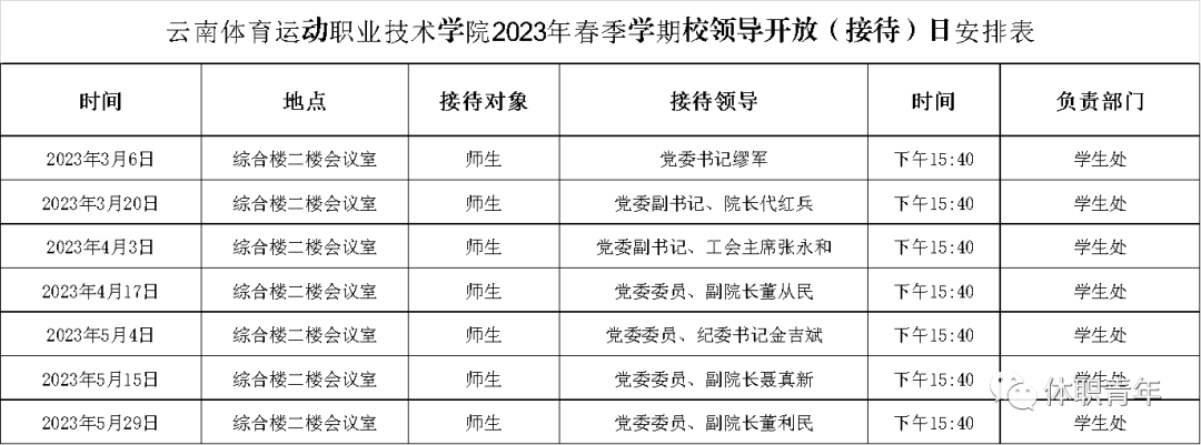 每周一下午15:40为校领导接待师生员工来访时间(节假日除外),由学校安排一名校领导负责接待工作。