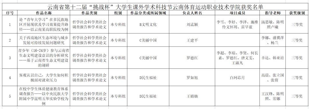 2023年6月4日,云南省第十二届“挑战杯”大学生课外学术科技节终审决赛在昆明医科大学呈贡校区举行,云南体职院5件作品入围省赛。