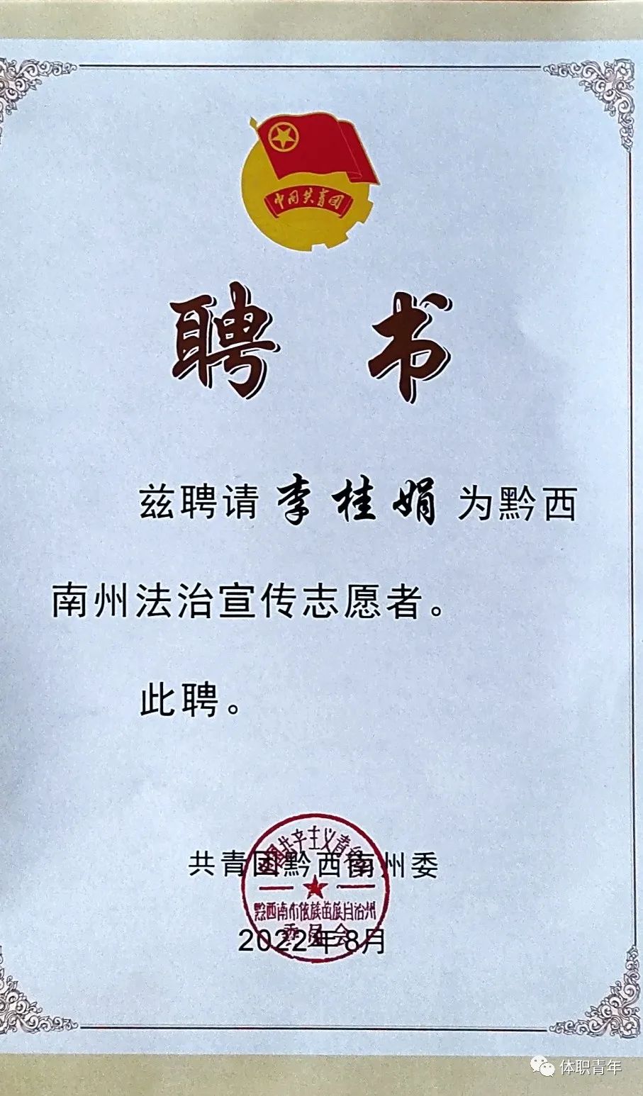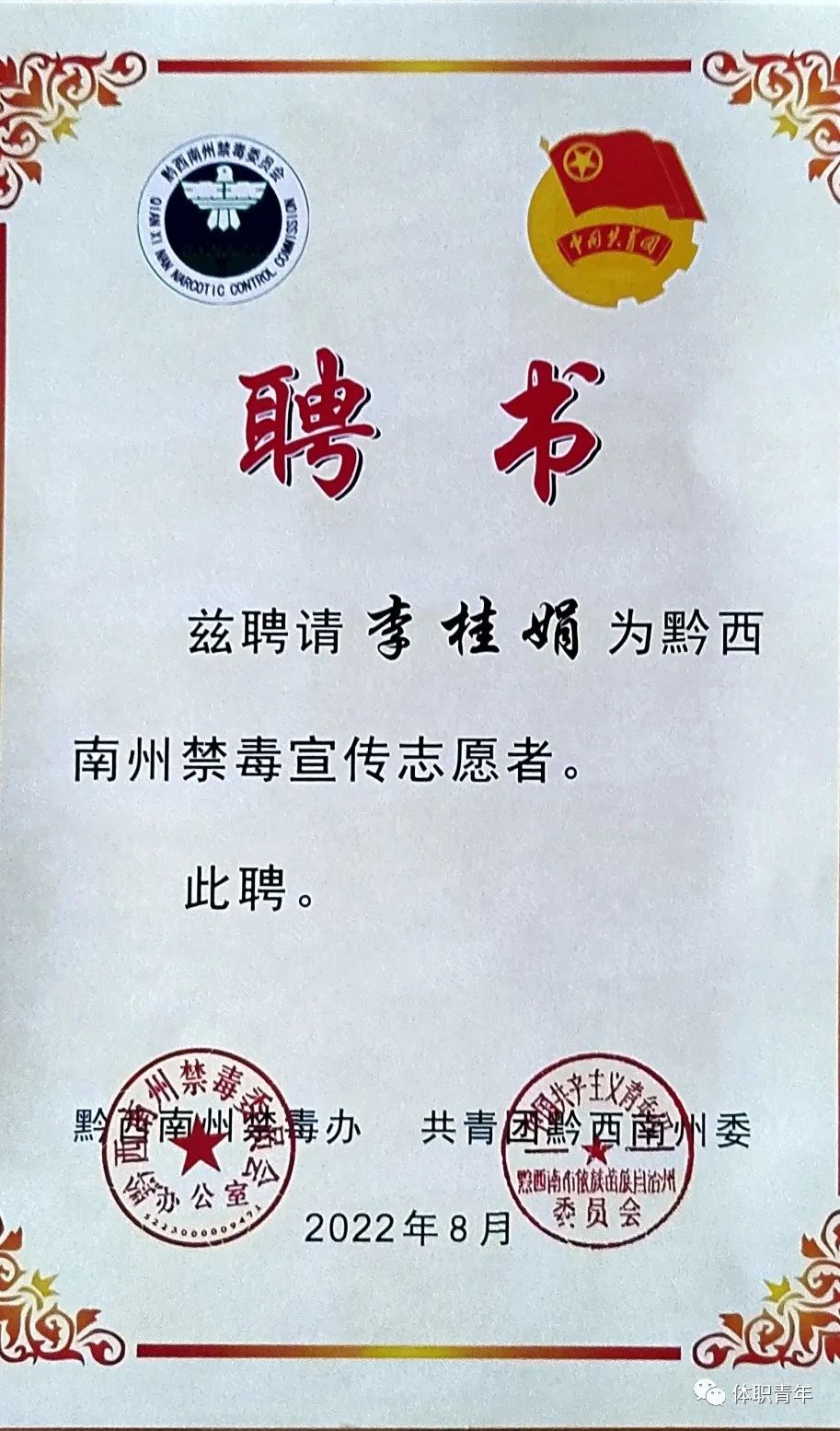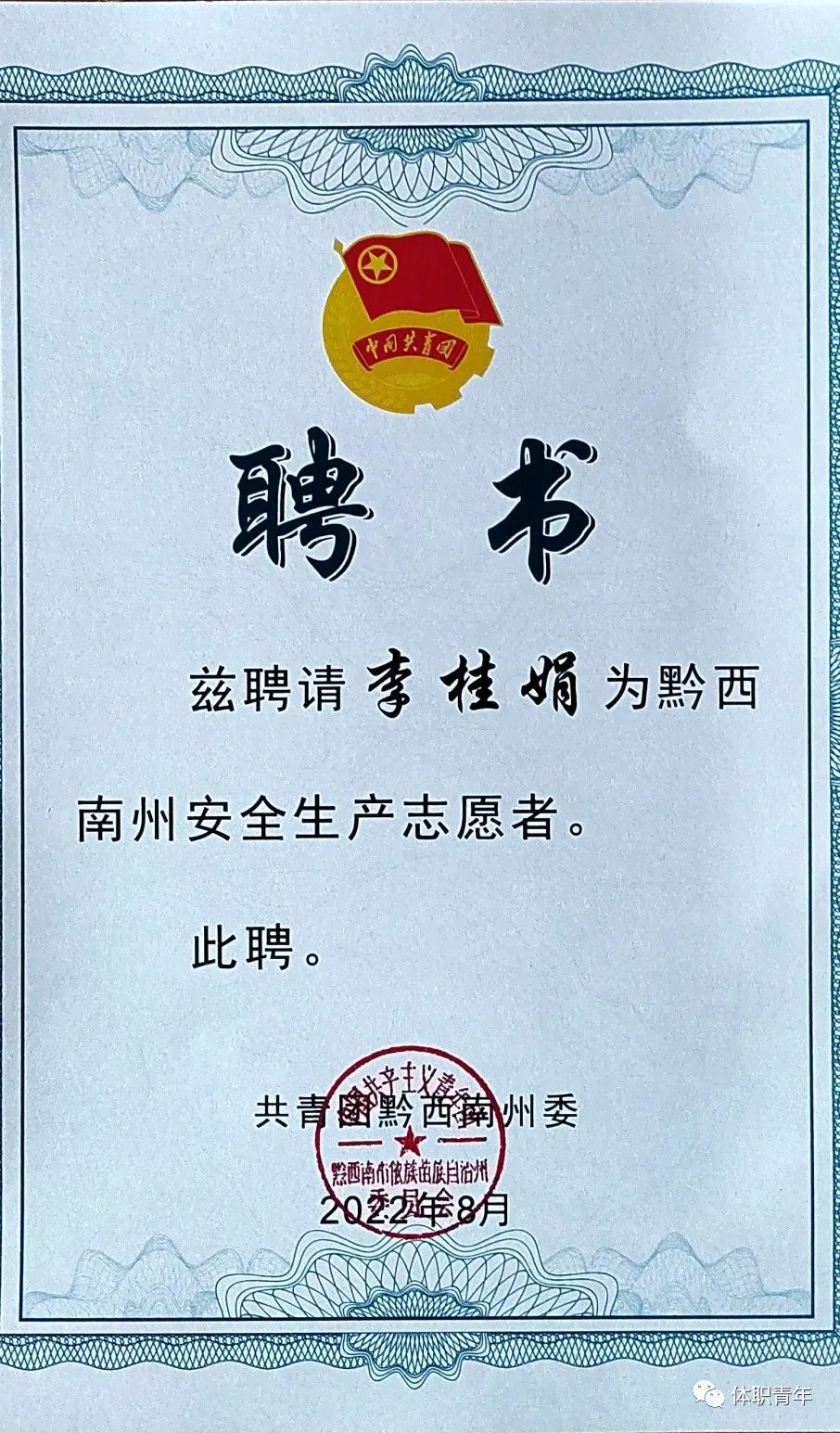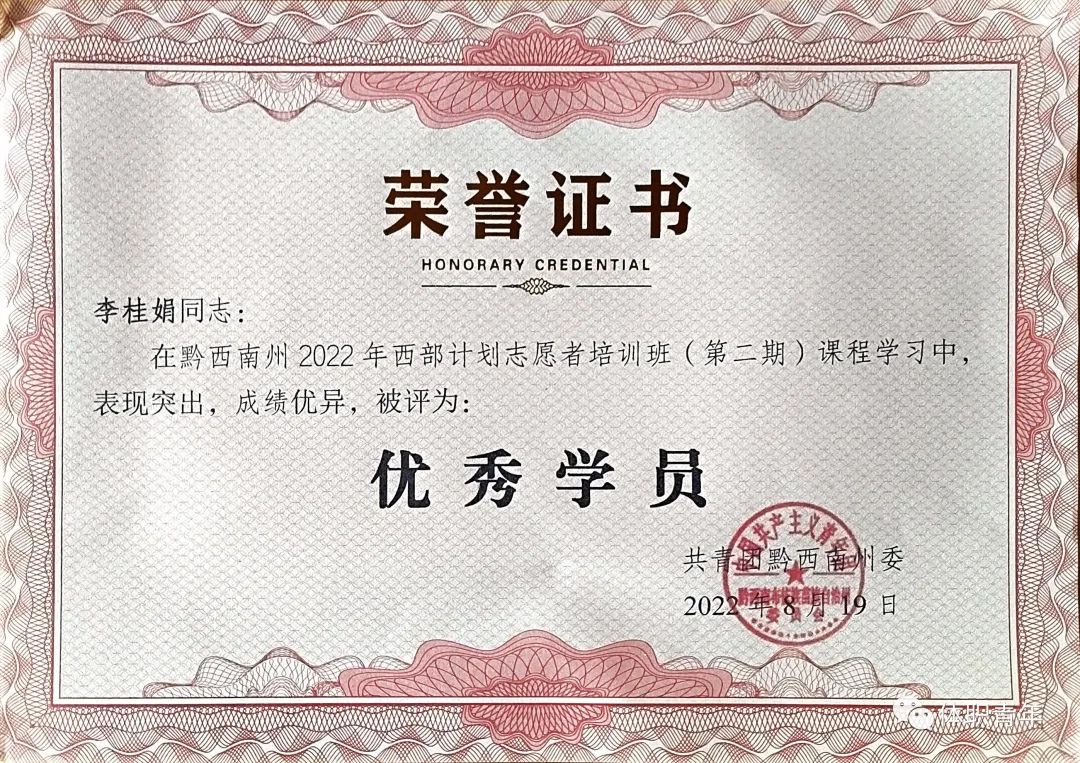 毕业后未选择留在实习单位工作,而是毅然决然地报名了学校大学生西部计划项目,功夫不负有心人,经过层层选拔考试,她以总分第一名的好成绩成功获得了唯一的岗位对接机会。于2022年8月李桂娟同学被共青团黔西南州委授予“优秀学员”称号。与此同时,李桂娟同学被聘请为黔西南州禁毒宣传志愿者、安全生产志愿者、法治宣传志愿者。她如愿成为一名大学生西部计划志愿者,来到贵州省黔西南州兴义市服务于乡村振兴基层项目。
