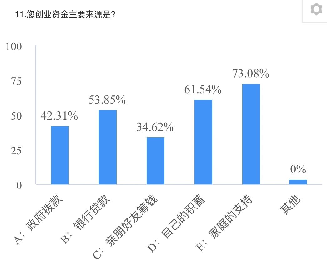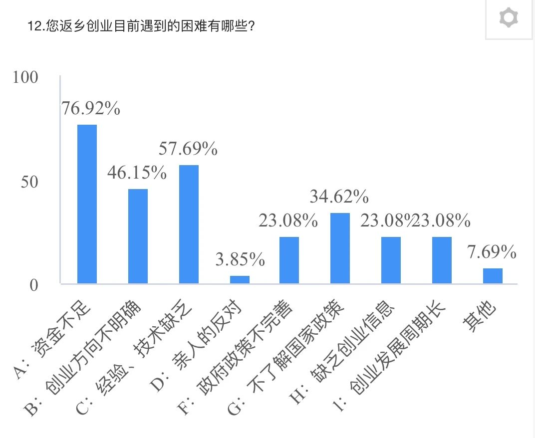 根据调查显示,返乡创业青年资金是最大困难点,创业风险大,难以获得足够的创业资金,大多数企业的创业资金都是来自于家人的投资和个人的存款,资金来源少,资金投入不足,限制了企业发展。