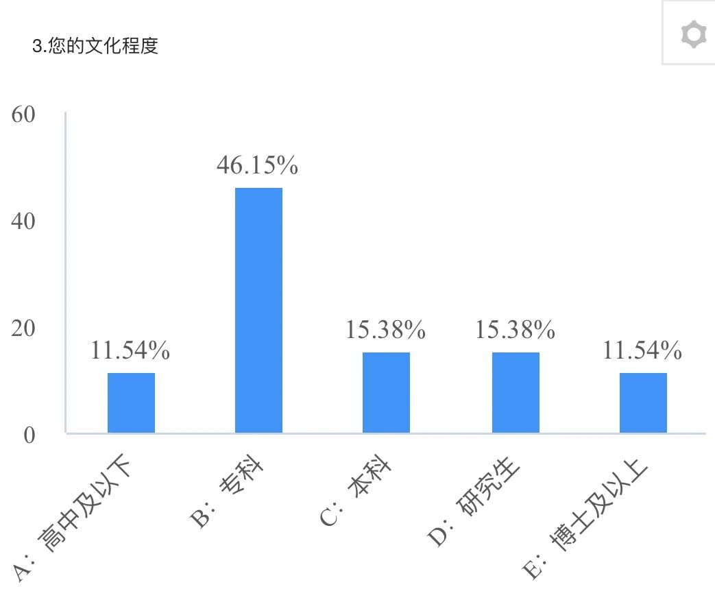 此次调查结果显示,现阶段,剑川县返乡创业青年群体年龄集中在18~25岁,相对于其他创业者,他们更加愿意接受新思想,对新事物也有较强的好奇心,在原有的创业方式上能做到更好的创新;本次调研对象中大部分青年具有大专及以上学历,高学历具有更强的适应性,能够充分融入当下的创业大环境,利用好资源优势。