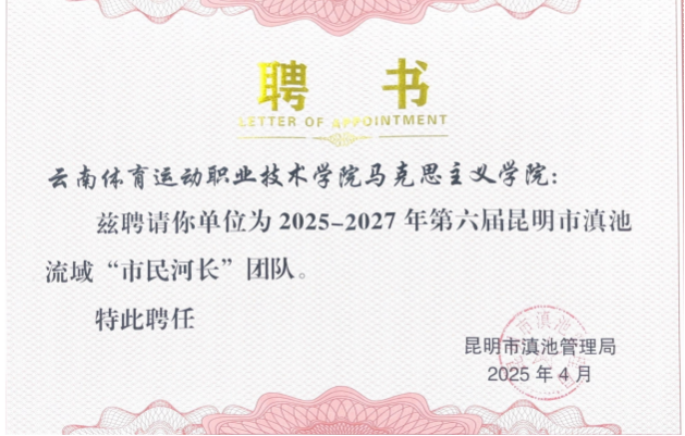 立足体育院校特色,打造“校内+校外”双平台。在校内挂牌校史馆、郭伟阳名师工作室,校外挂牌云南省滇池保护治理科普中心、中共卫城社区委员会共4个实践教学基地,每学年常态化开展4次以上主题实践教学活动,强化了育人实效。2025年,学院被聘请为2025—2027年第六届昆明市滇池流域“市民河长”团队,将实践育人与社会服务深度融合。