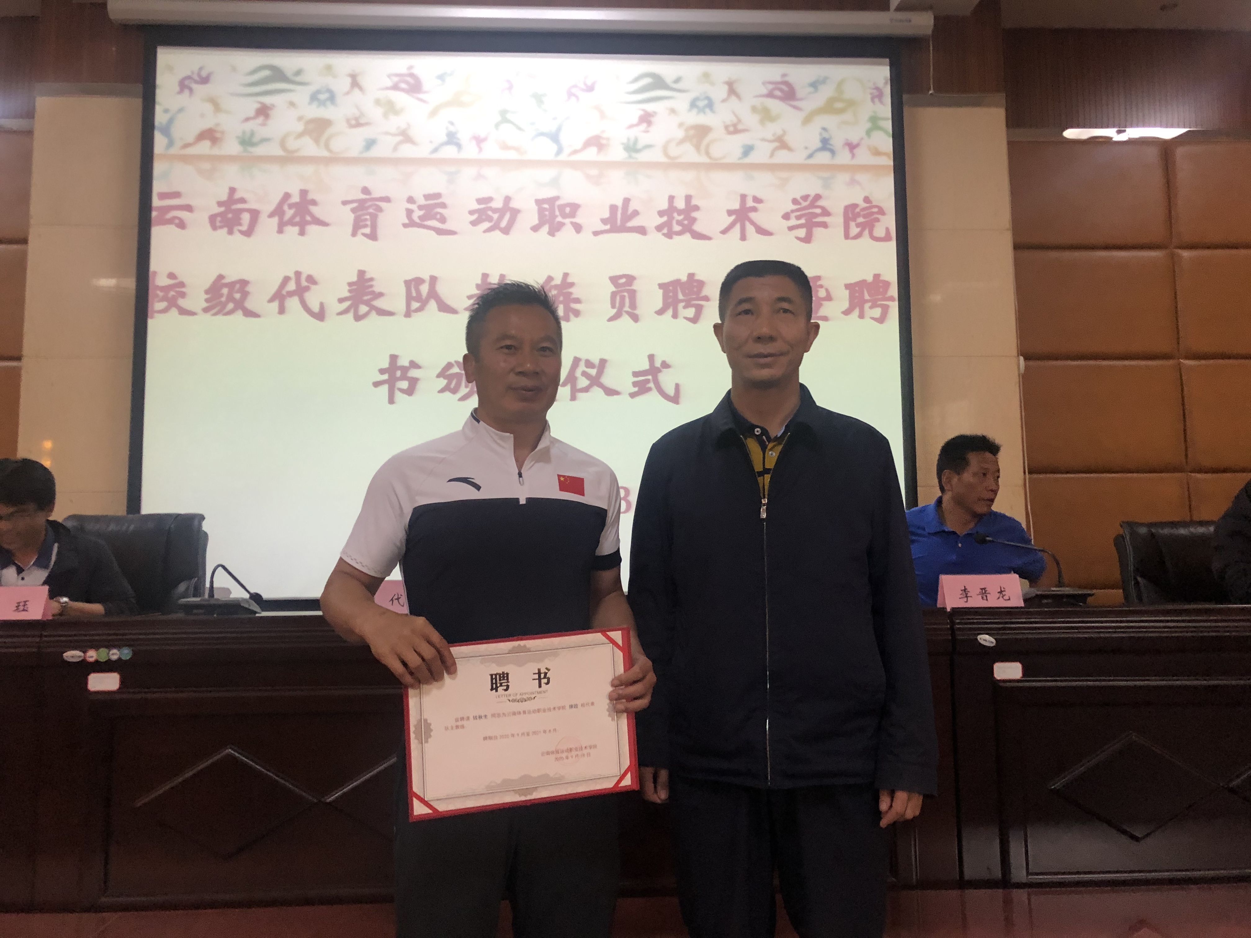2020年9月18日,竞技体育学院举行校代表队教练员聘用暨聘书颁发仪式,学校党委副书记、院长代红兵同志出席了颁发仪式并为各队教练员颁发了聘书。仪式上,代红兵院长要求各代表队运动员做到品学兼优,运动成绩和文化学习双优秀。同时也鼓励运动员要顽强拼搏、勇创佳绩,为云南体职院争光添彩。