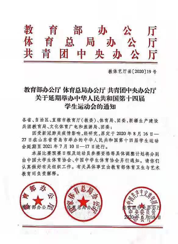 原定于2020年8月在山东青岛举行的中华人民共和国第十四届学生运动会因疫情影响延期至2021年7月10日—17日举行。