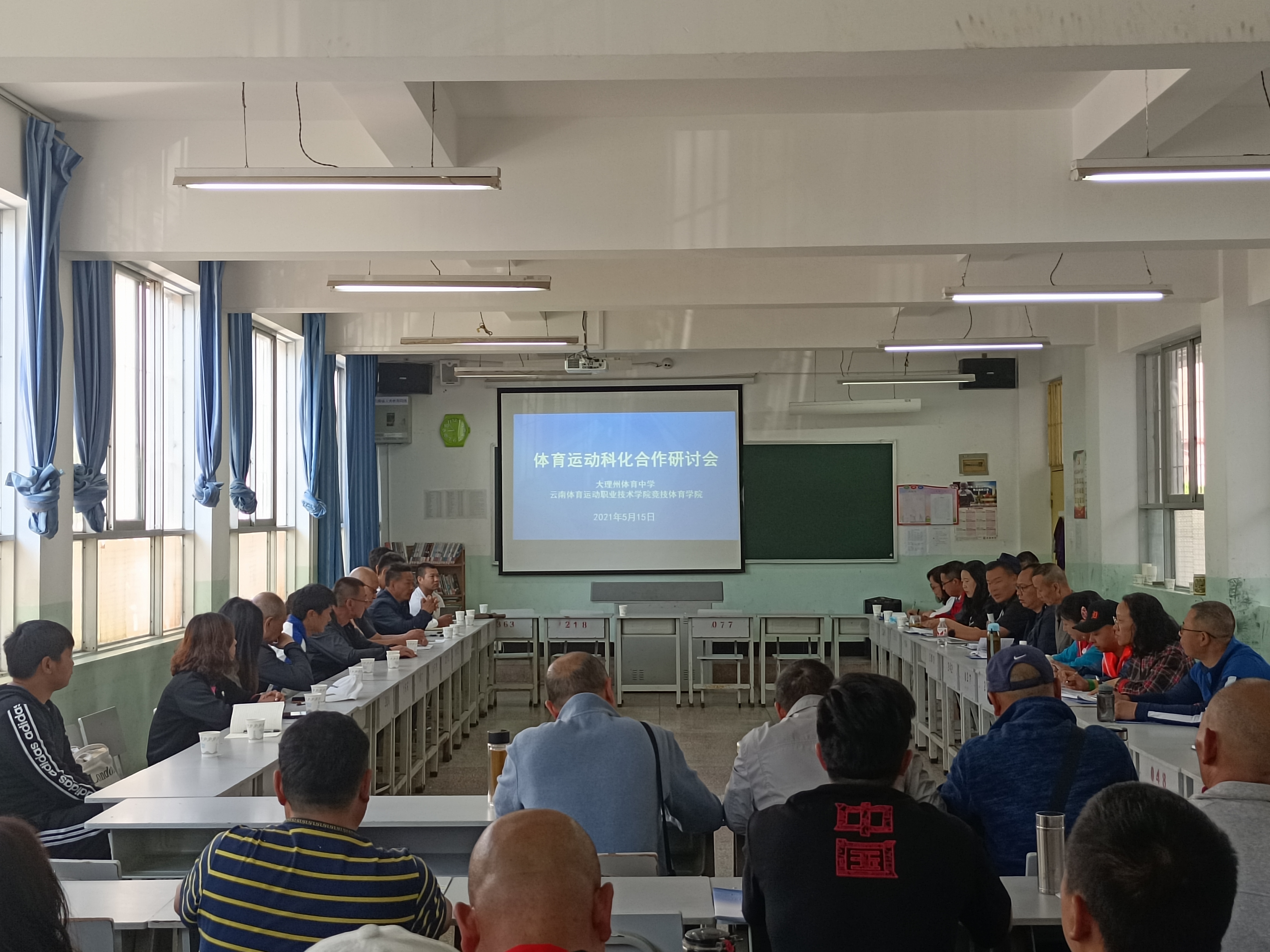 2021年5月14日allwincity万象城官方网站委派竞技体育学院院长李晋龙、竞技体育学院党总支副书记王敬红、竞技体育学院副院长丁珏、竞技体育学院专职组织员姚振斌、排球总教练杨栋、田径总教练韩金如及相关各项目教练员、科研人员一行人赴大理州体育中学进行科化研讨、招生宣传工作。