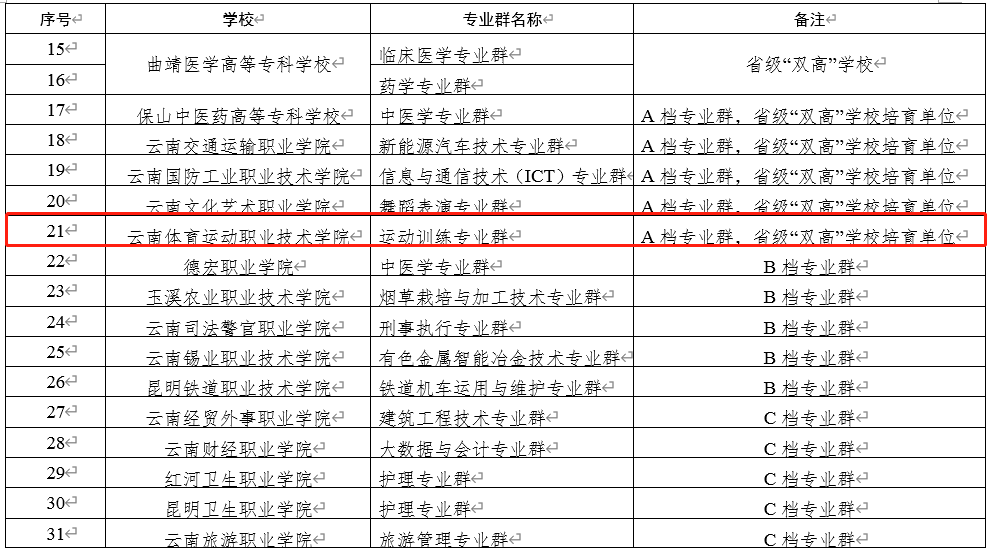 12月23日,云南省教育厅官方网站发布《关于云南省省级高水平高等职业学校和高水平专业群建设项目评审结果的公示》,万象城官网运动训练专业群成功入围省级A档高水平专业群立项建设院校名单,并成为省级“双高”学校培育单位。
