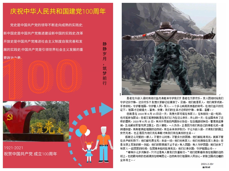 虽然本次活动是在寒假期间开展,存在人员分散,时间紧,任务重等因素的影响,但大家拿出了认真负责的态度和主动担当的精神,形成了二级学院领导力抓,辅导员指导,团委和学生会组织,班委和同学落实的开展模式。从2021年2月12日的筹备开始,经过作品设计、初选、修改、定稿等多个环节,历时半个多月的时间,最终从征集到的作品中,选定了9类作品中较好的作品各1件,按时按质地提交至学校学生处。