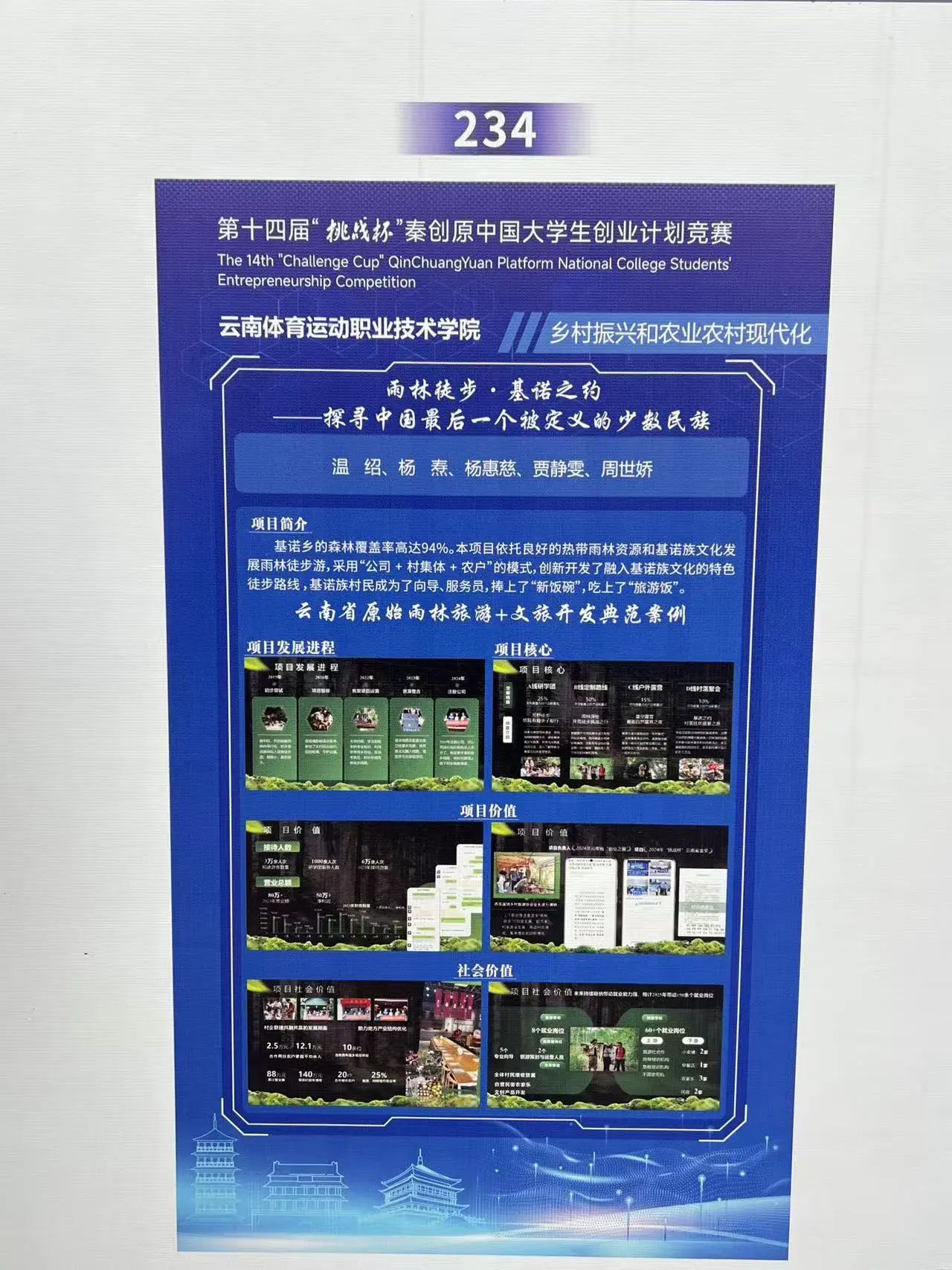 2024年11月2日,由共青团中央、教育部、人力资源社会保障部、中国科协、全国学联和陕西省人民政府联合主办,西安交通大学、共青团陕西省委承办的第十四届“挑战杯”中国大学生创业计划竞赛在西安落下帷幕。万象城官网报送项目“雨林徒步·基诺之约——探寻中国最后一个被定义的少数民族”荣获主体赛银奖。该成绩是“挑战杯”系列竞赛中学校最好成绩,系学校创新创业教育工作的重大突破。
