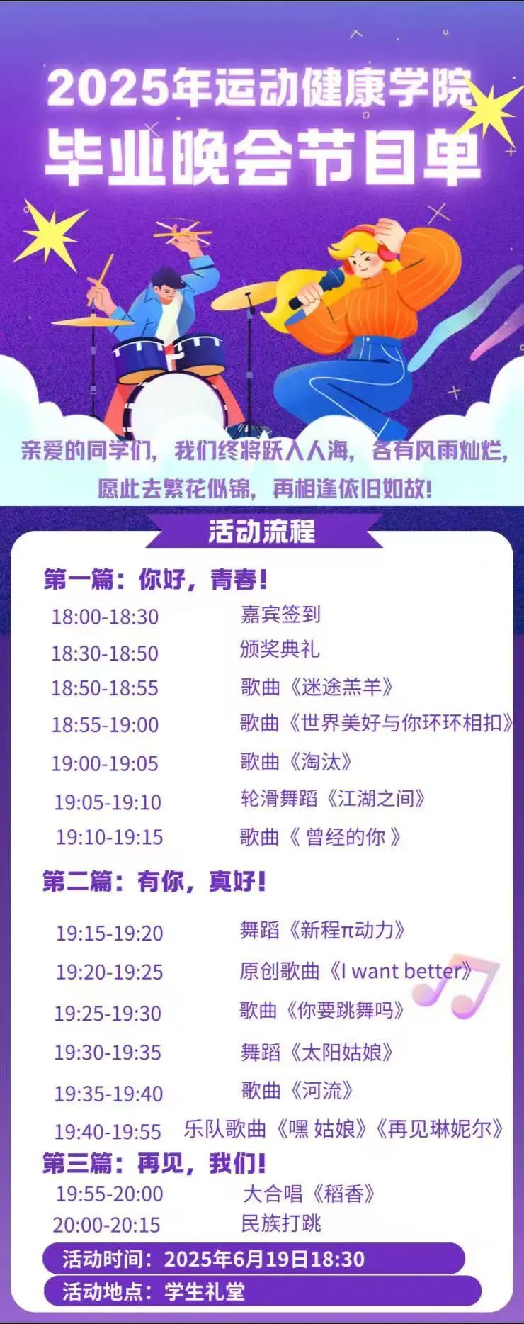 2025年运动健康学院“跃动青春,逐梦未来”毕业典礼暨表彰大会将于2025年6月19日(周四)18:30在学生礼堂举行。