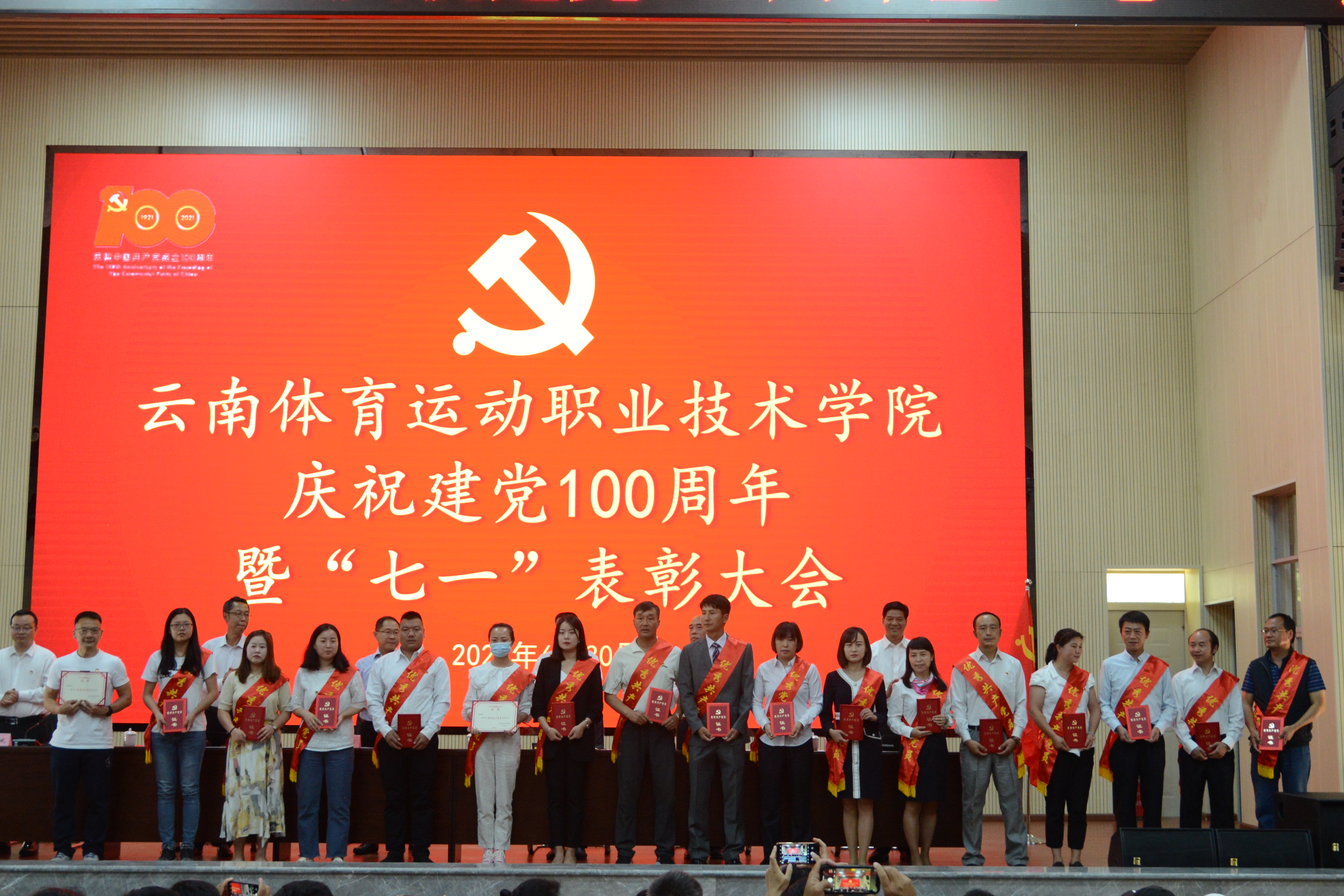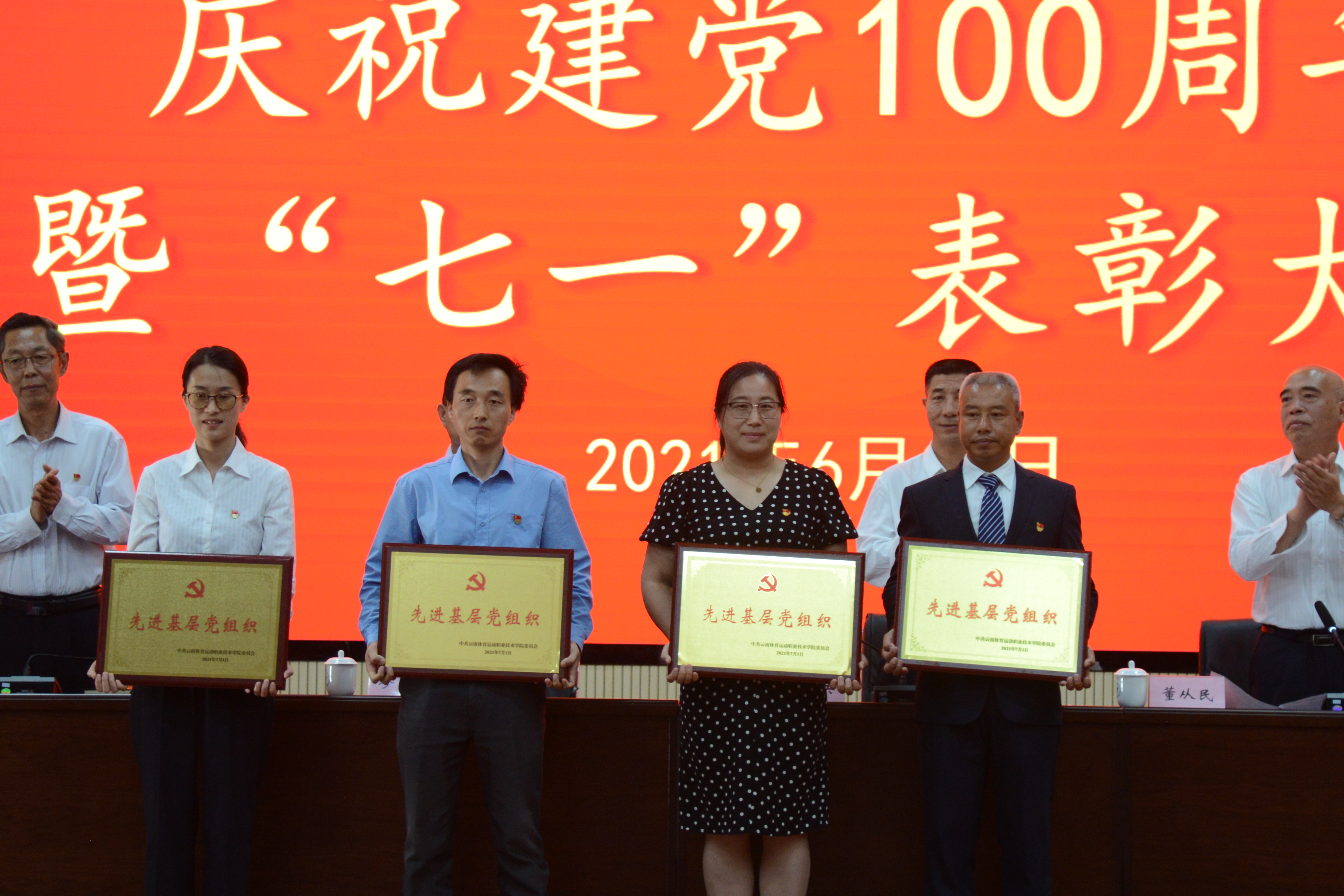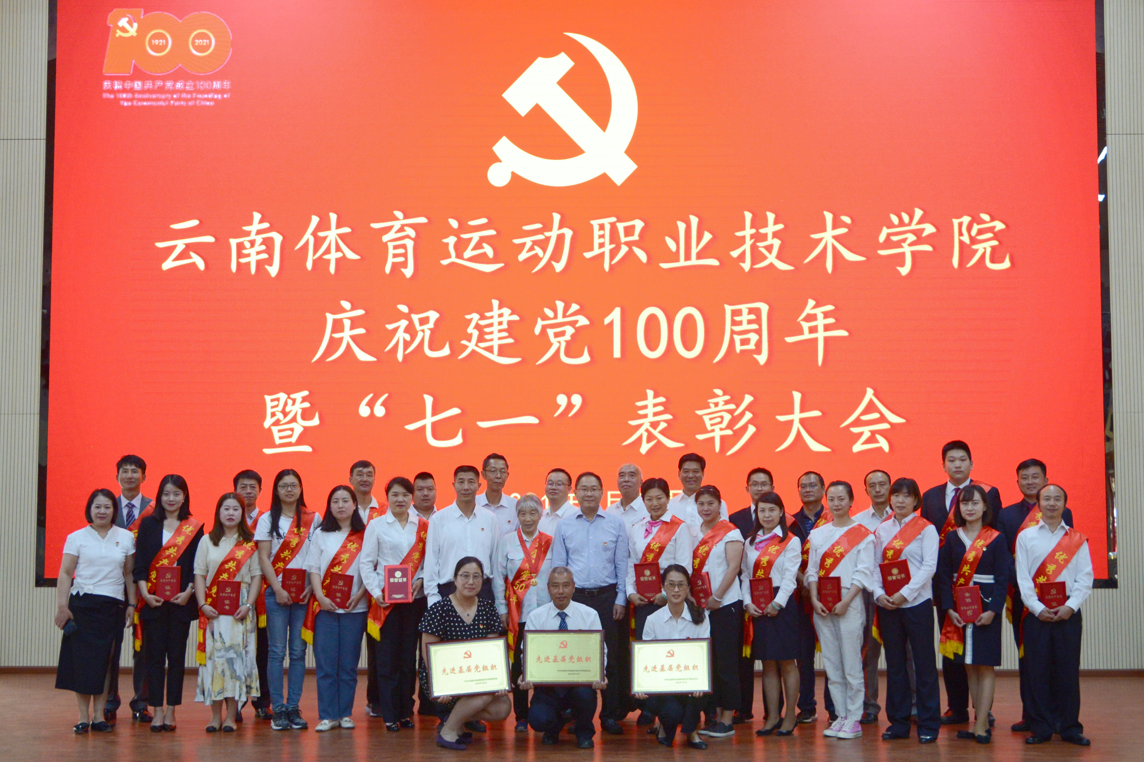 6月30日,在中国共产党成立100周年之际,allwincity万象城官方网站召开庆祝中国共产党成立100周年暨“七一”表彰大会,旨在回顾党的历史,庆祝党的生日,对过去一年工作中涌现出来的先进个人和集体进行表彰,进一步坚定信心,抢抓机遇,为打造国内一流体育高职院校不懈努力。学校党委领导班子成员、副科级以上干部、全体教职工、学生党员、入党积极分子、学生代表参加了此次表彰大会。会议由副院长董从民主持。
