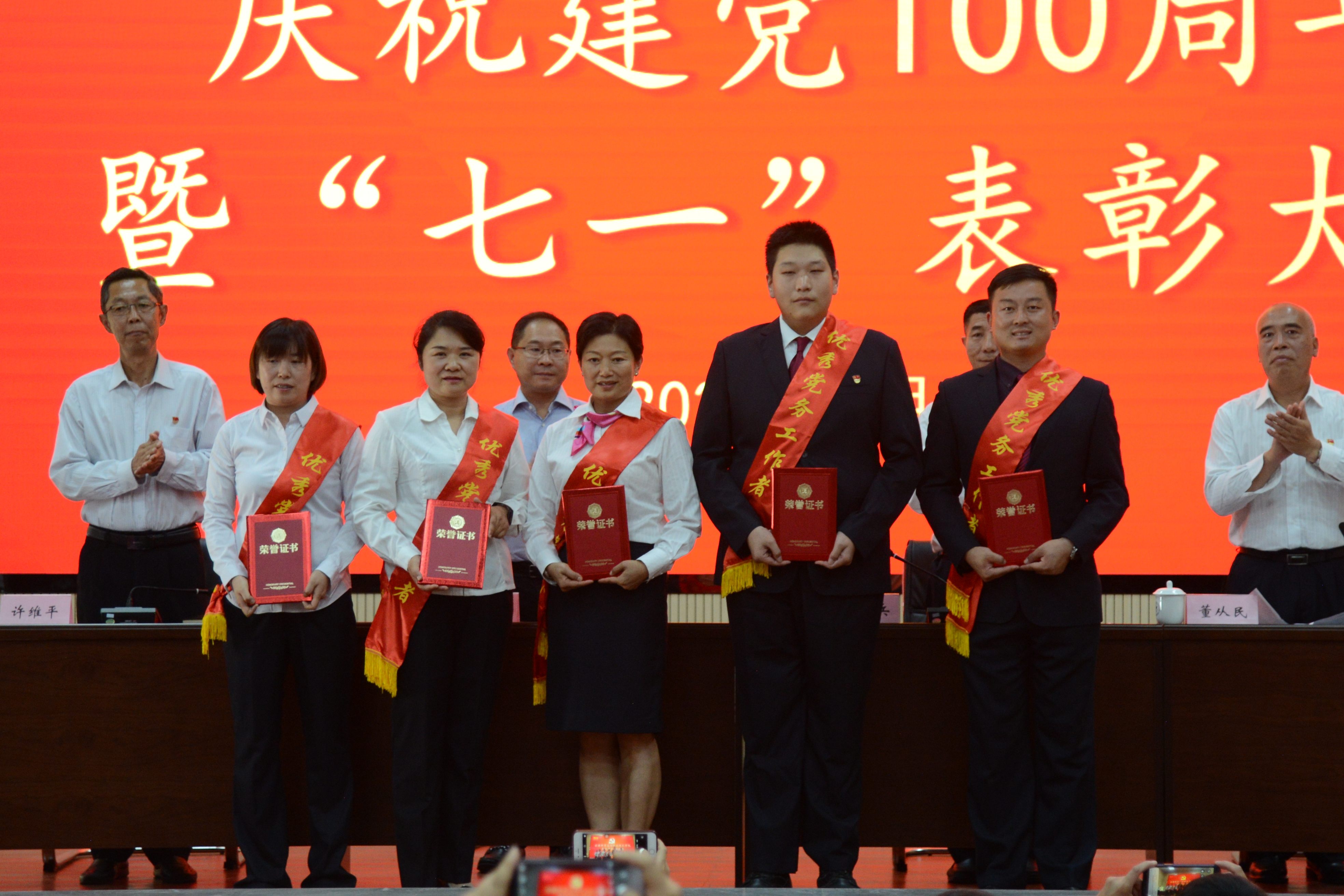 (党委班子成员为优秀党务工作者颁发证书)
