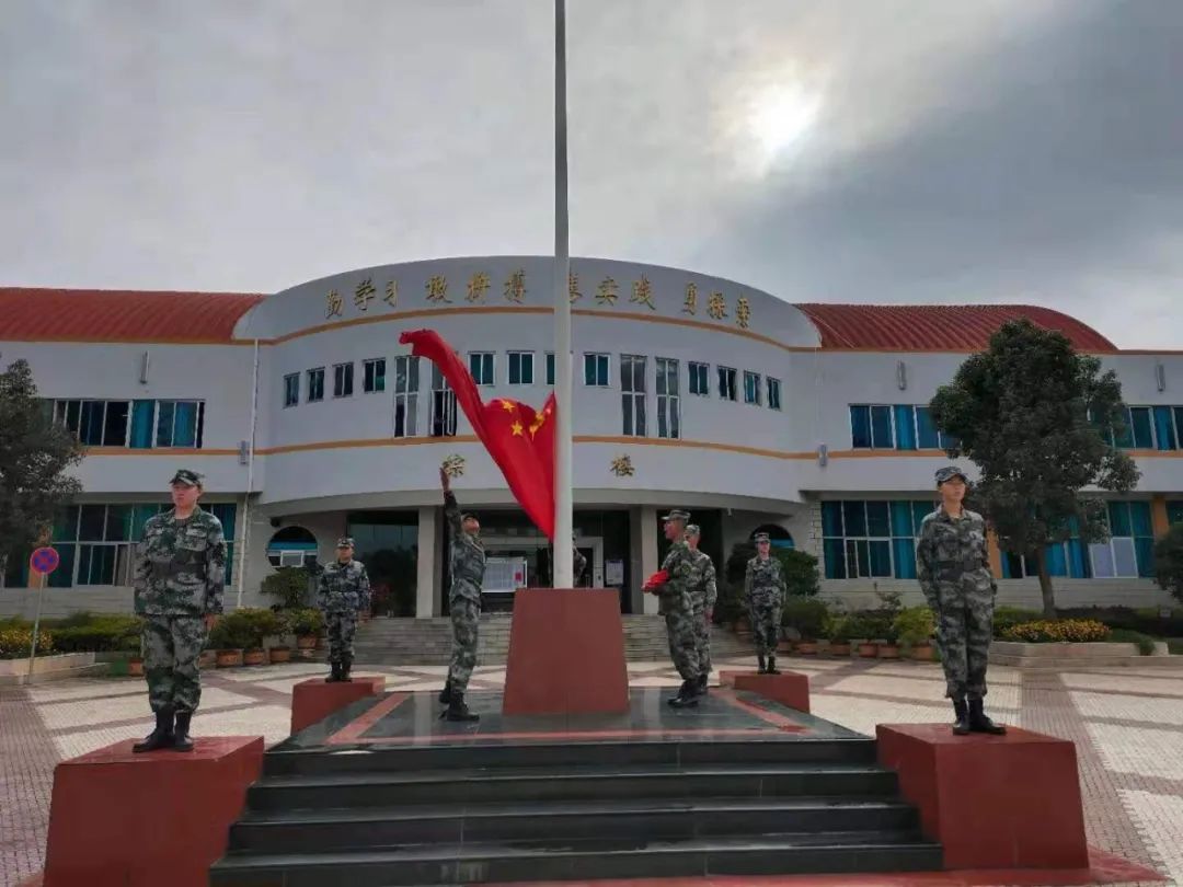 在主持人宣布升旗仪式开始后,国旗护卫队迈着整齐的步伐将国旗护送至升旗台,在嘹亮的国歌声中,全体师生行注目礼,仰望着冉冉升起的国旗,鲜艳的五星红旗迎风飘扬。全场肃穆,齐声高唱国歌。