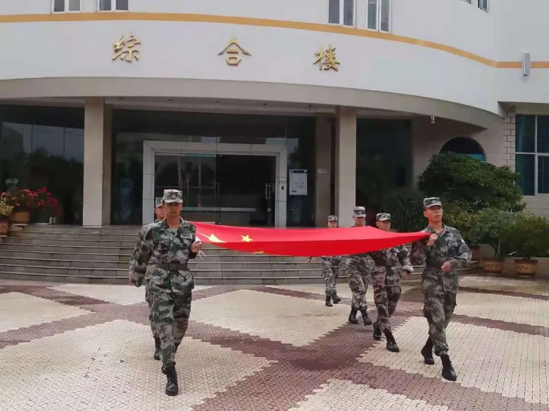 在主持人宣布升旗仪式开始后,国旗护卫队踏着整齐的步伐,护卫着鲜艳的国旗一步布走向升旗台,全体师生肃立,庄严的唱起国歌,五星红旗也在旗手的拉动下逐渐到达杆顶。