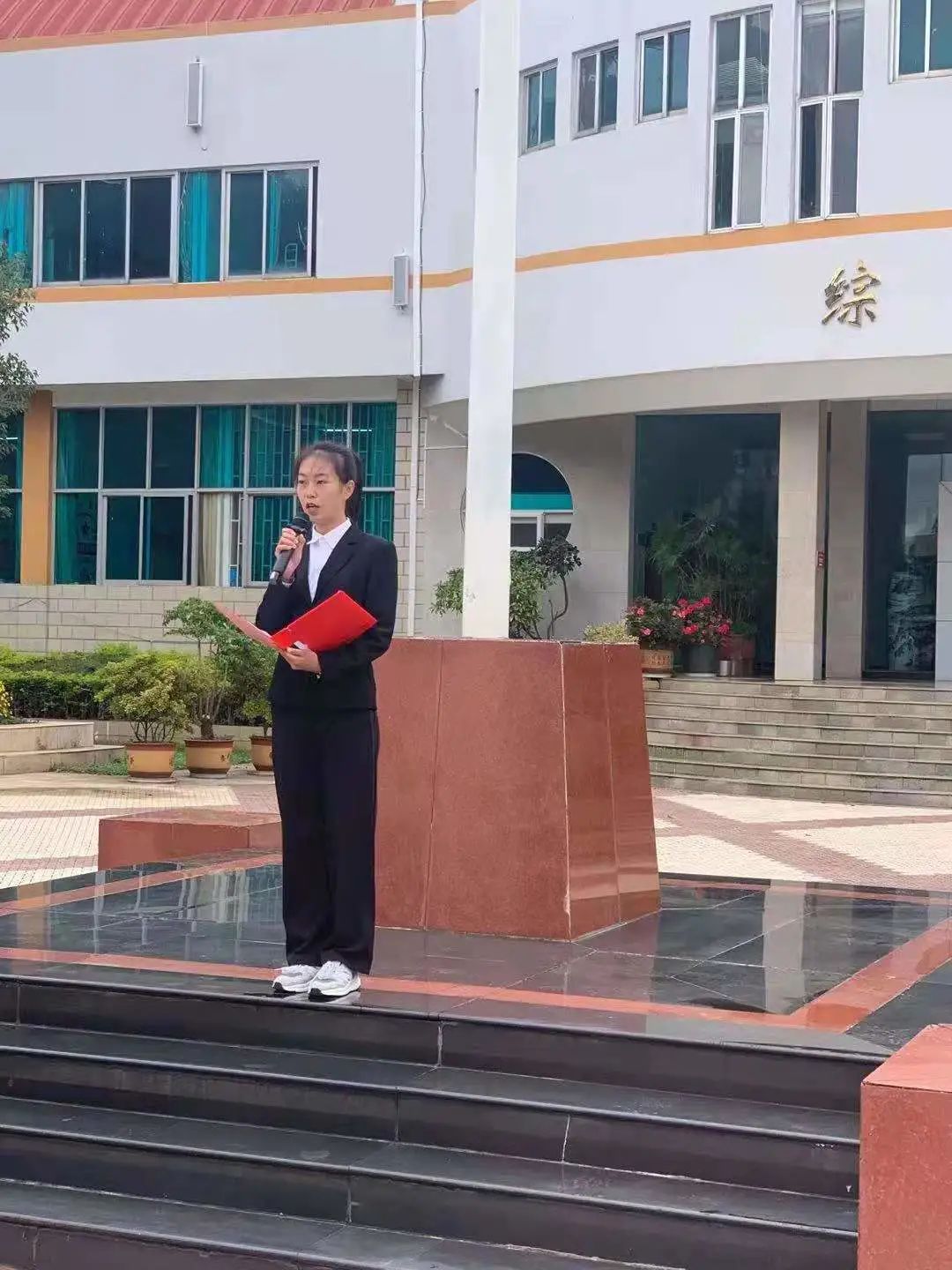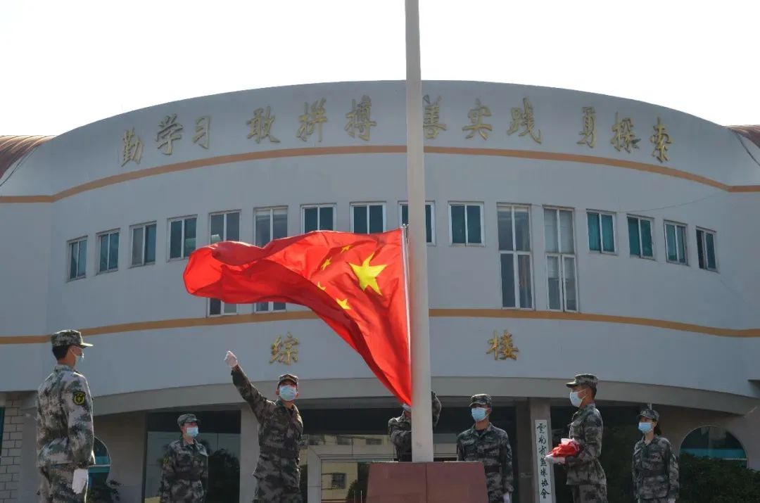 在主持人宣布升旗仪式开始后,国旗护卫队迈着整齐的步伐将国旗护送至升旗台,伴随着庄严的国歌,五星红旗冉冉升起,在场的每一个人都向国旗行注目礼,表达了对祖国崇高的敬意。