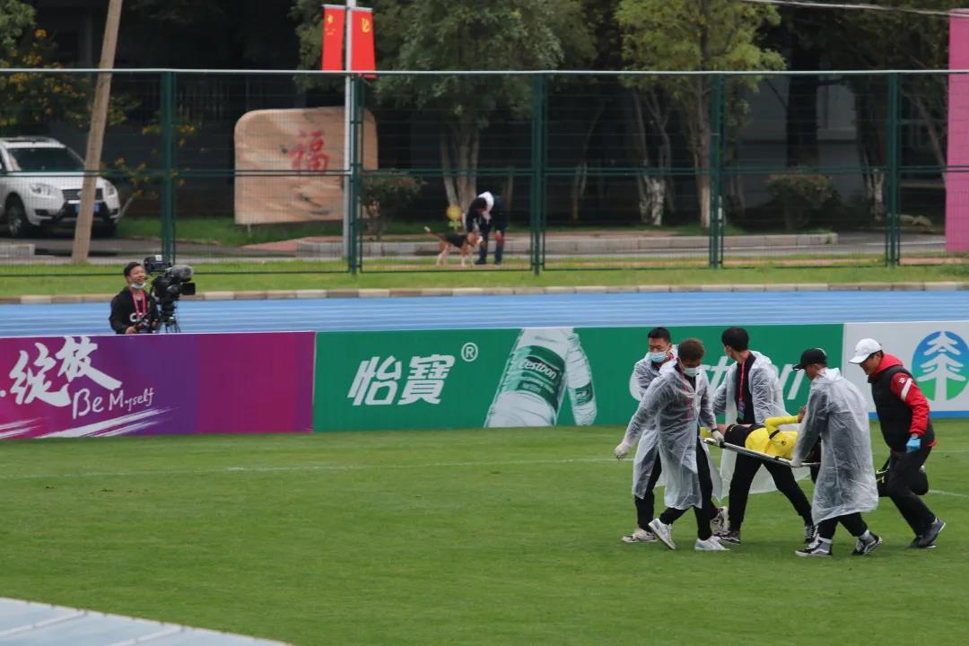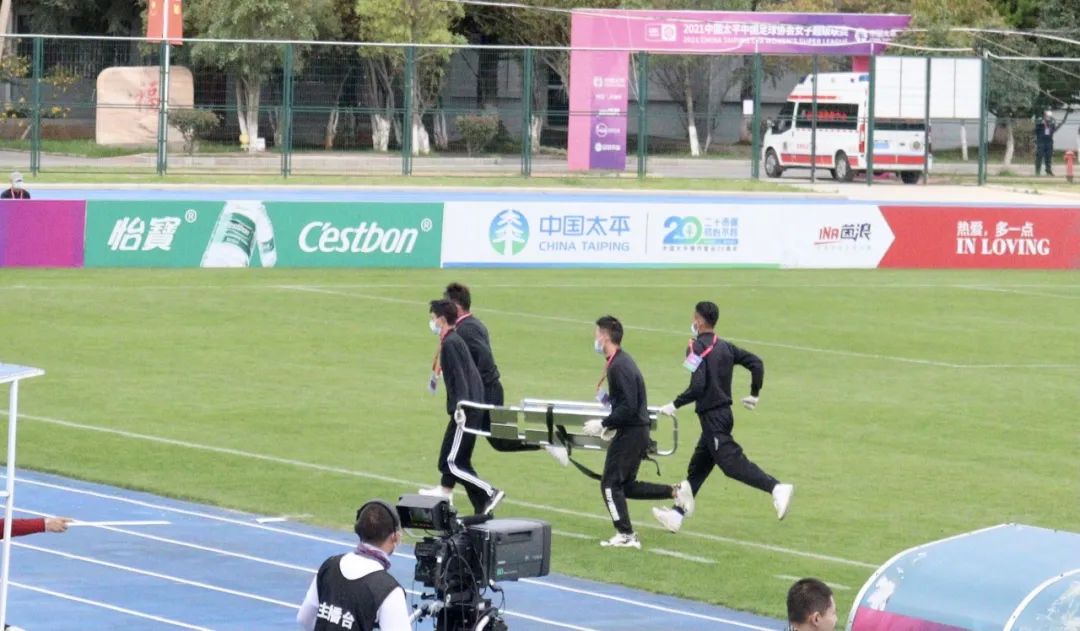 10月22日下午,在5号球场长春大众置业与河南建业女足的比赛中,两队队员抢球失误,冲撞在一起,导致其中一队队员严重受伤,志愿者们第一时间接收到裁判的信号,将受伤的球员送上了救护车,确保球员及时得到治疗。